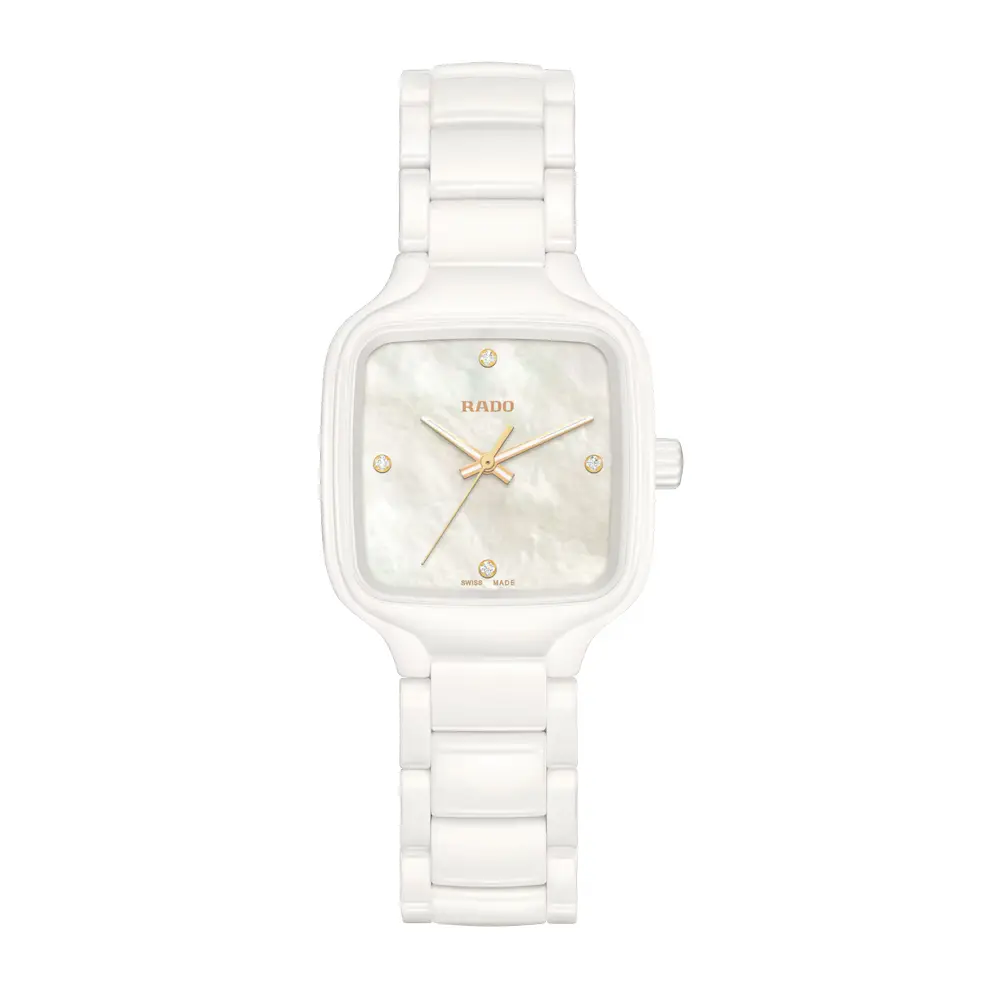 Rado True Square Diamonds R27072902 完美展现了 现代优雅与女性魅力。其标志性 29 毫米方形表壳 采用 白色高科技陶瓷 制成,光泽细腻,轻盈且防刮耐磨。珍珠母贝表盘 镶嵌 12 颗钻石时标,闪耀低调奢华光芒。