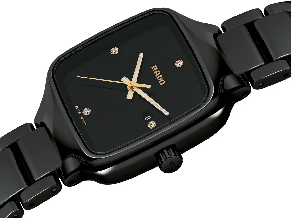 Rado True Square Diamonds R27080722 将现代几何设计、高端材质与女性优雅完美融合。其 29 毫米方形陶瓷表壳 是 True Square 系列的标志,具备 轻盈、舒适 和 防刮耐用 特性。陶瓷材质为抗过敏材质,非常适合日常佩戴。