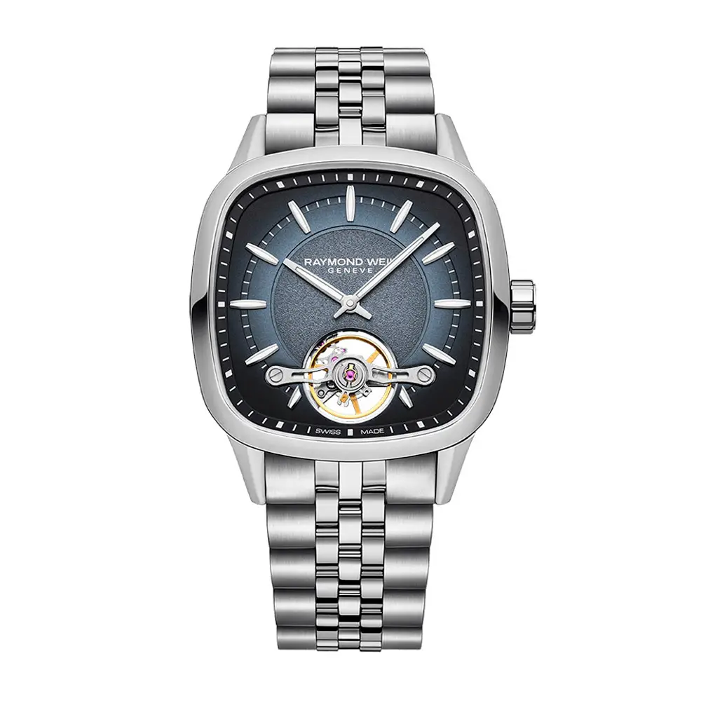 Raymond Weil Freelancer 2790-ST-50051 诠释了 卓越工艺、独特设计与瑞士精准制表精神。其 40 × 40 毫米不锈钢表壳 灵感源自复古造型,呈现现代几何美感。蓝色渐变表盘 搭配 开放式摆轮窗口(Open Balance Wheel),展现 RW1212 机芯的精密律动。