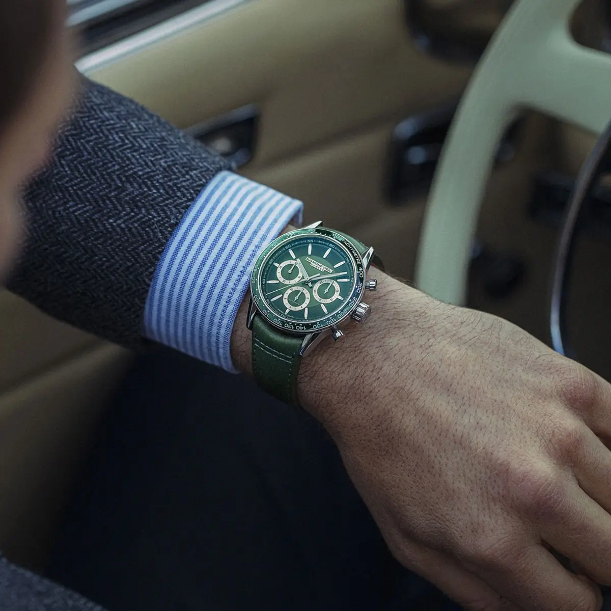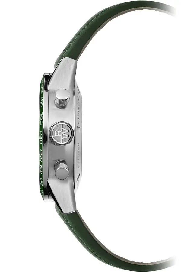 腕表配备 43.5 毫米不锈钢表壳,结合拉丝与抛光工艺,并搭载 绿色陶瓷测速表圈,兼具时尚与实用。绿色表盘 设有 三眼计时小盘 与 4点至5点之间的日期窗,Super-LumiNova® 夜光指针与时标 提供出色可读性。