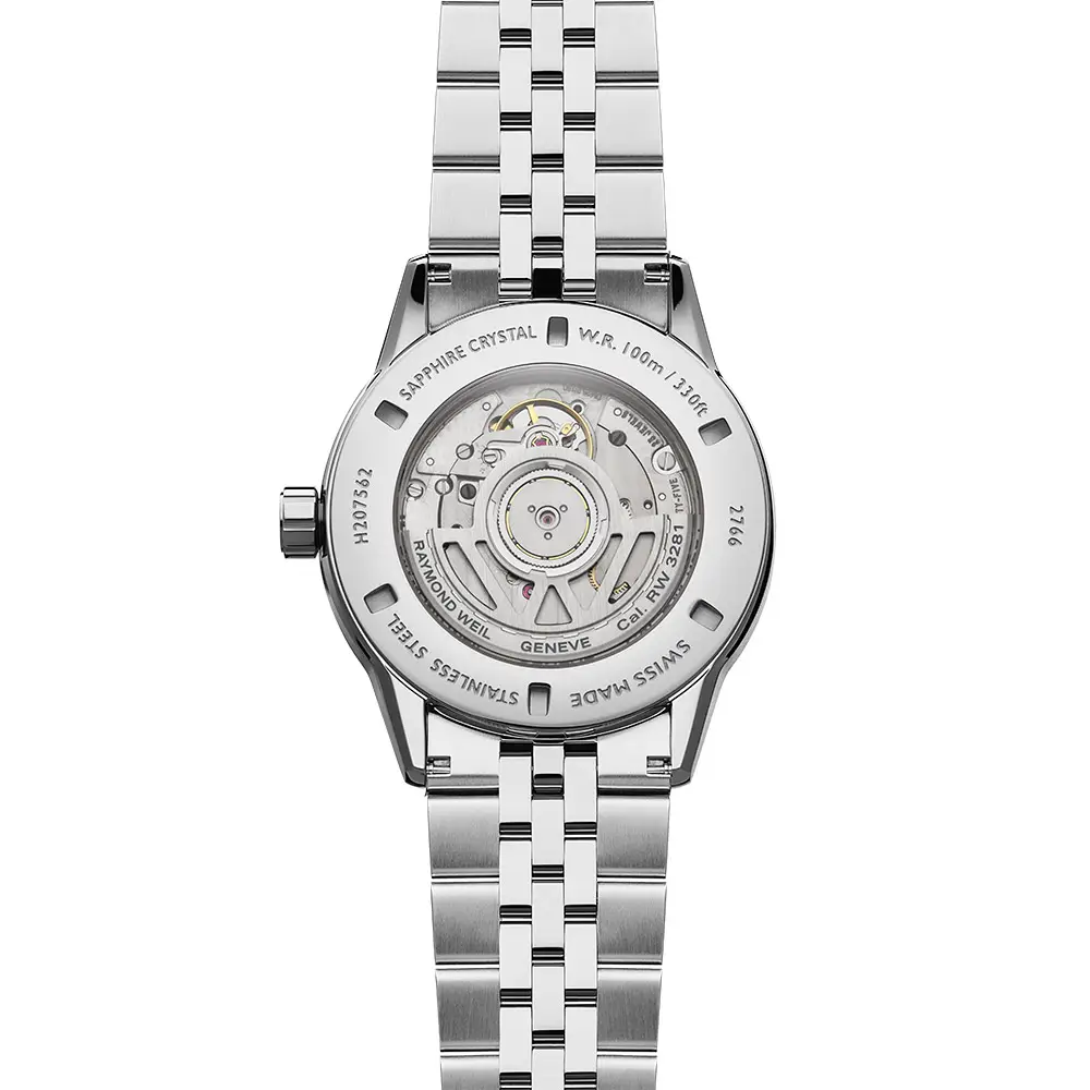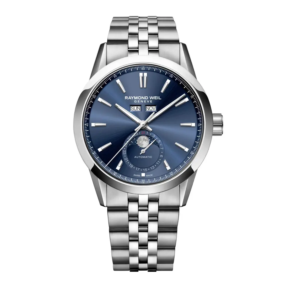 Raymond Weil Freelancer 完整日历腕表 40mm (2766-ST-50001) 兼具瑞士精准与高级复杂功能之一 —— 完整日历。其 40 毫米精钢表壳,厚度 10.15 毫米,配备防反光蓝宝石镜面与旋入式表冠,饰以 RW 标志。具备 100 米(10 ATM)防水性能,适合日常佩戴。