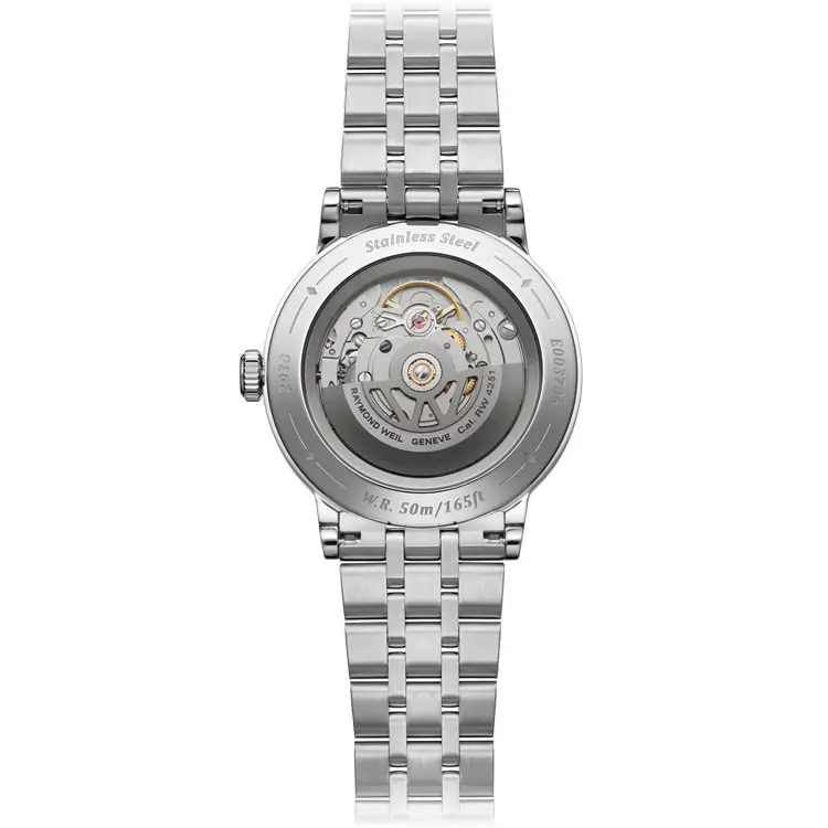 腕表搭载 瑞士自动上链机芯 RW4251,具备 41 小时动力储备,走时精准平稳。透过 蓝宝石透明底盖,可欣赏饰有 Raymond Weil 标志的精美摆陀,展现品牌卓越工艺。50 米防水性能 让其适合日常佩戴及正式场合。