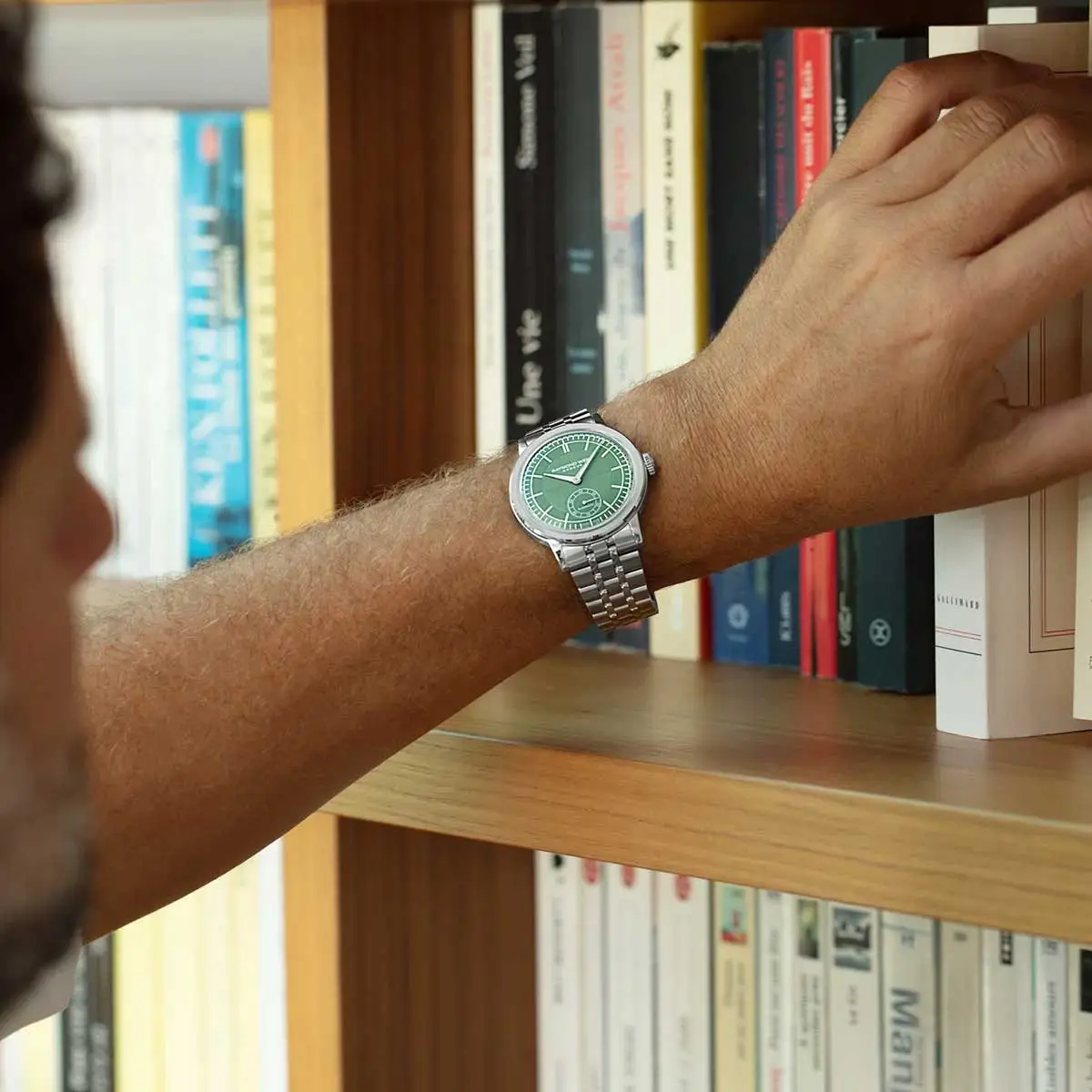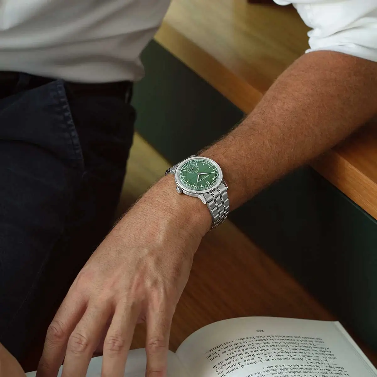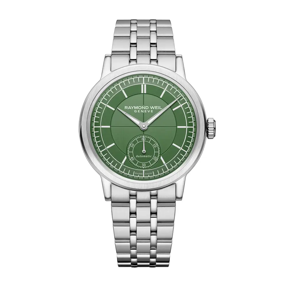 Raymond Weil Millesime 2930-ST-52001 兼具 复古美学与现代优雅。其 39.5 毫米不锈钢表壳 搭配 弧形防眩光蓝宝石水晶镜面,呈现独特的 “glassbox” 复古设计。绿色分区表盘 质感细腻,并设有 6 点位置的小秒针盘,为整体布局增添层次与平衡。