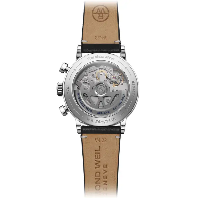 Raymond Weil Millesime 7765-STC-20001 是一款男士计时腕表,完美融合了 经典设计与现代制表工艺。其 39.5 毫米不锈钢表壳 搭配 弧形防眩光蓝宝石水晶镜面,呈现出灵感源自 1950 年代的 “glassbox” 复古风格。黑色分区表盘 配有对比鲜明的小表盘、测速刻度圈,以及 夜光指针与刻度,确保出色的可读性。