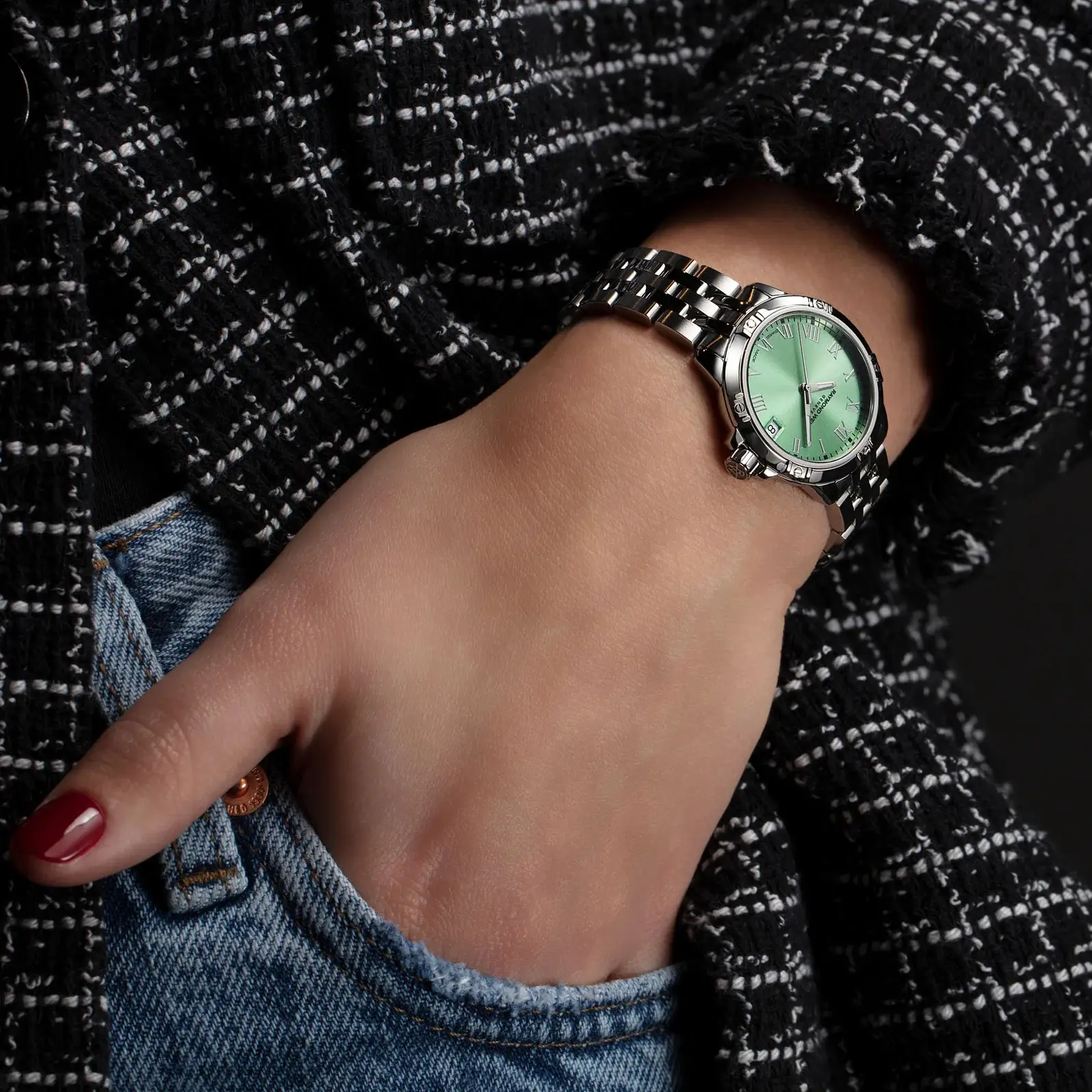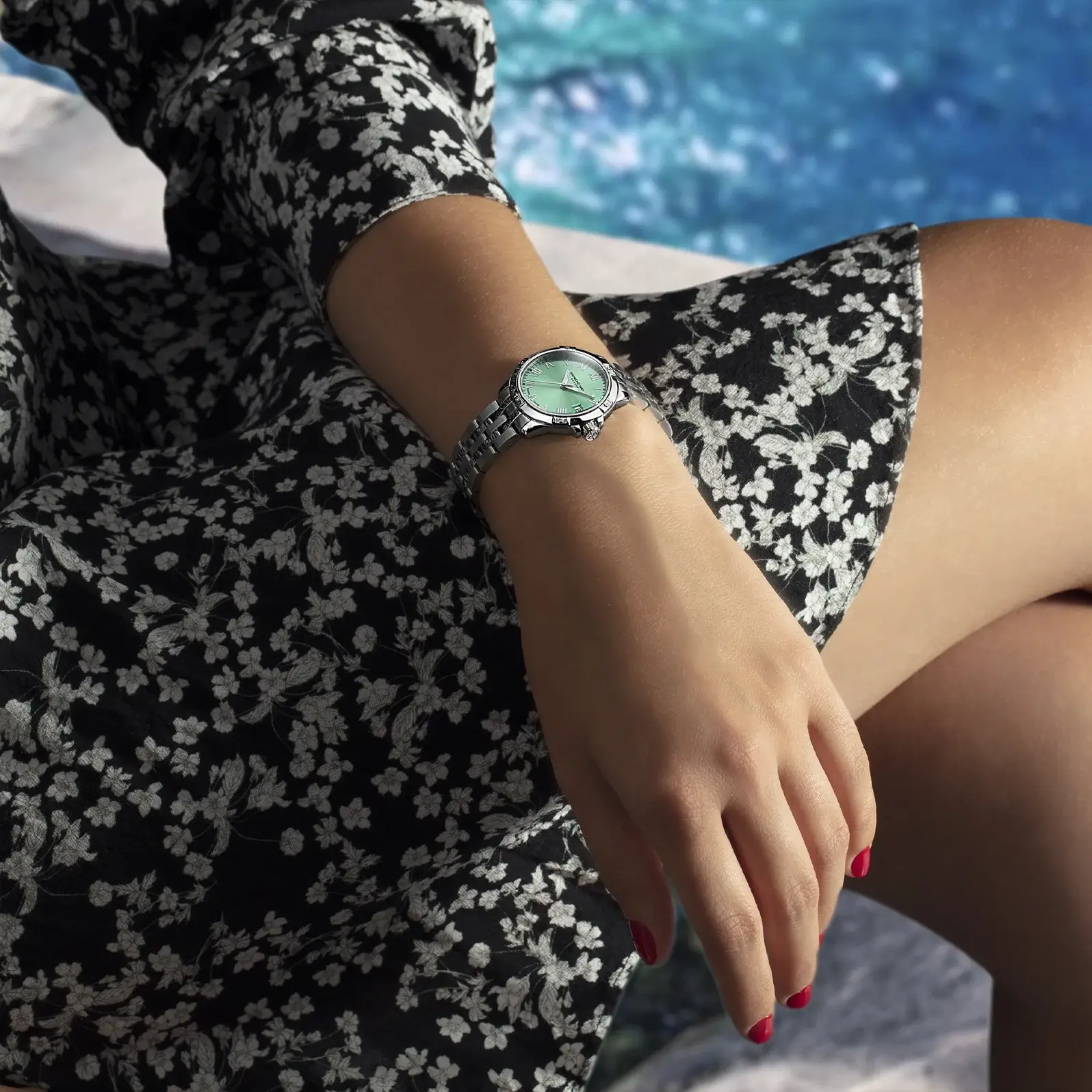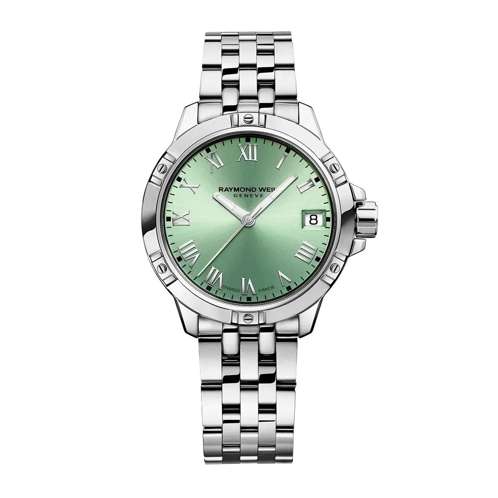 Raymond Weil Tango 5960-ST-00520 融合了 优雅设计、精致细节与瑞士精密工艺。30 毫米不锈钢表壳 配备 防刮擦蓝宝石镜面,浅绿色太阳纹表盘 配有 罗马数字刻度、夜光指针 和 3 点位置日期窗,展现出实用与高雅的完美平衡。