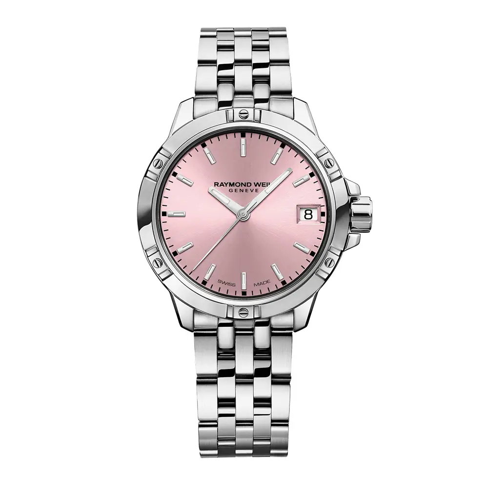 Raymond Weil Tango 5960-ST-80001 结合了 瑞士优雅、女性柔美与实用设计。直径 30 毫米的不锈钢表壳 搭配系列标志性的装饰螺钉表圈,外形纤薄、比例协调,适合日常佩戴与正式场合。