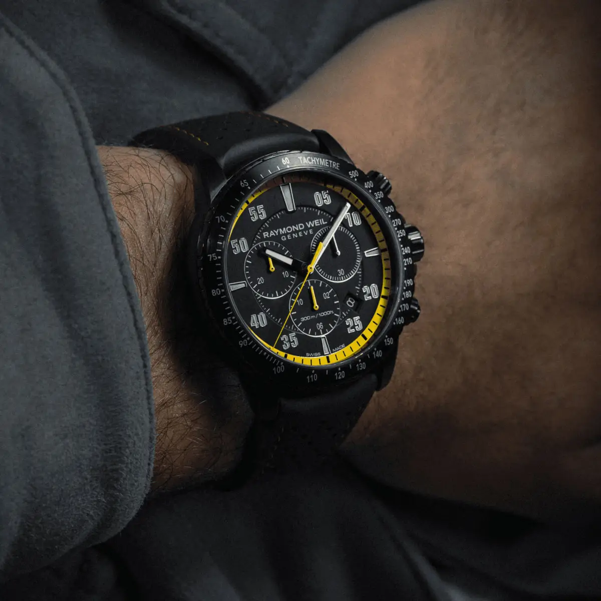 雷蒙威尔探戈8570-BKR-05275是一款精致的男士手表,将功能性与优雅完美结合。这款来自探戈300系列的腕表拥有43毫米黑色PVD涂层不锈钢表壳,赋予手表现代感的外观。黑色阳极氧化铝表圈配备测速计,增添运动美感,而黑色表盘点缀黄色细节和三个计时码表,提升了风格和功能。