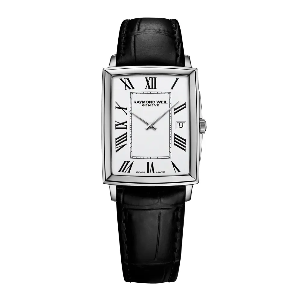 Raymond Weil Toccata 5425-STC-00300 结合了 经典矩形外观、极简优雅与瑞士精准工艺。37.25 × 29.60 毫米不锈钢表壳 配备 防刮擦蓝宝石镜面,保护着 白色表盘,饰以 黑色罗马数字 和 3 点位置日期窗。