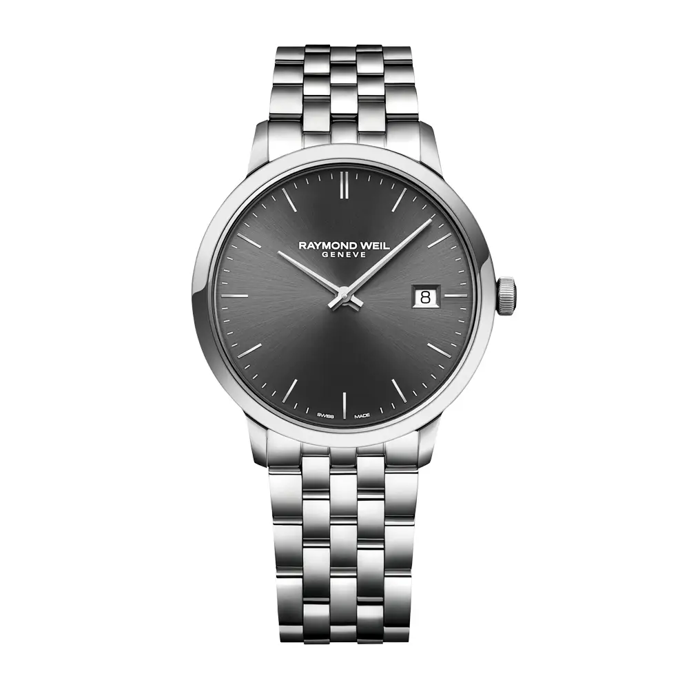 Raymond Weil Toccata 5588-ST-60001 融合了 经典优雅、现代简约与瑞士精准制表工艺。其 42 毫米抛光不锈钢表壳 配备 防刮擦蓝宝石镜面,搭载 放射状灰色表盘,配有 银色指针与刻度。3 点位置日期窗 提升实用性,同时保持平衡美感。