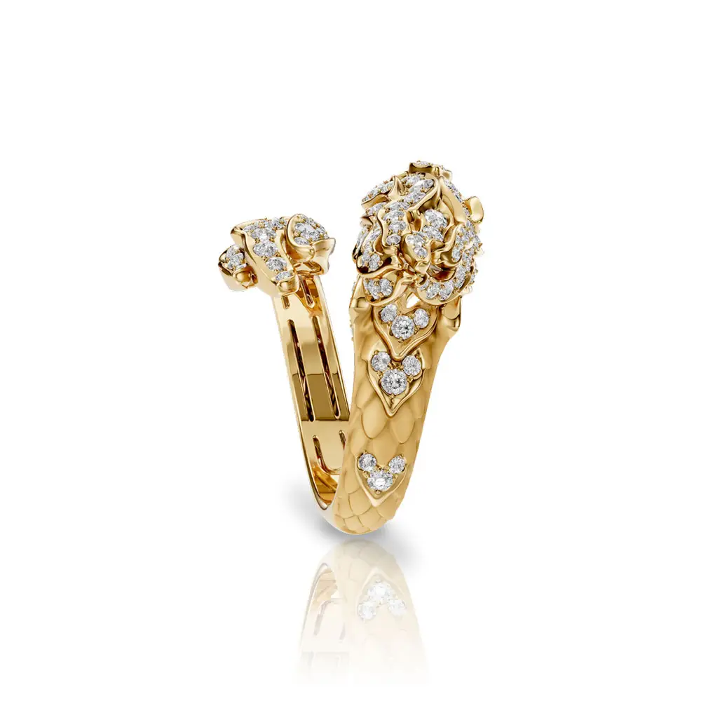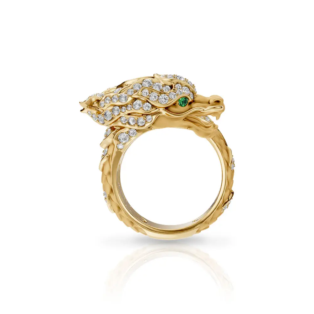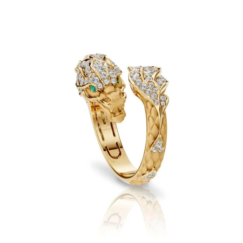 Carrera y Carrera New Shanghai Maxi Pavé戒指是一件雄伟的珠宝,将龙的力量与手工艺的精致完美结合。这款标志性的 18K 黄金珠宝以最奢华的方式体现了传说中权力、保护和幸运的象征。