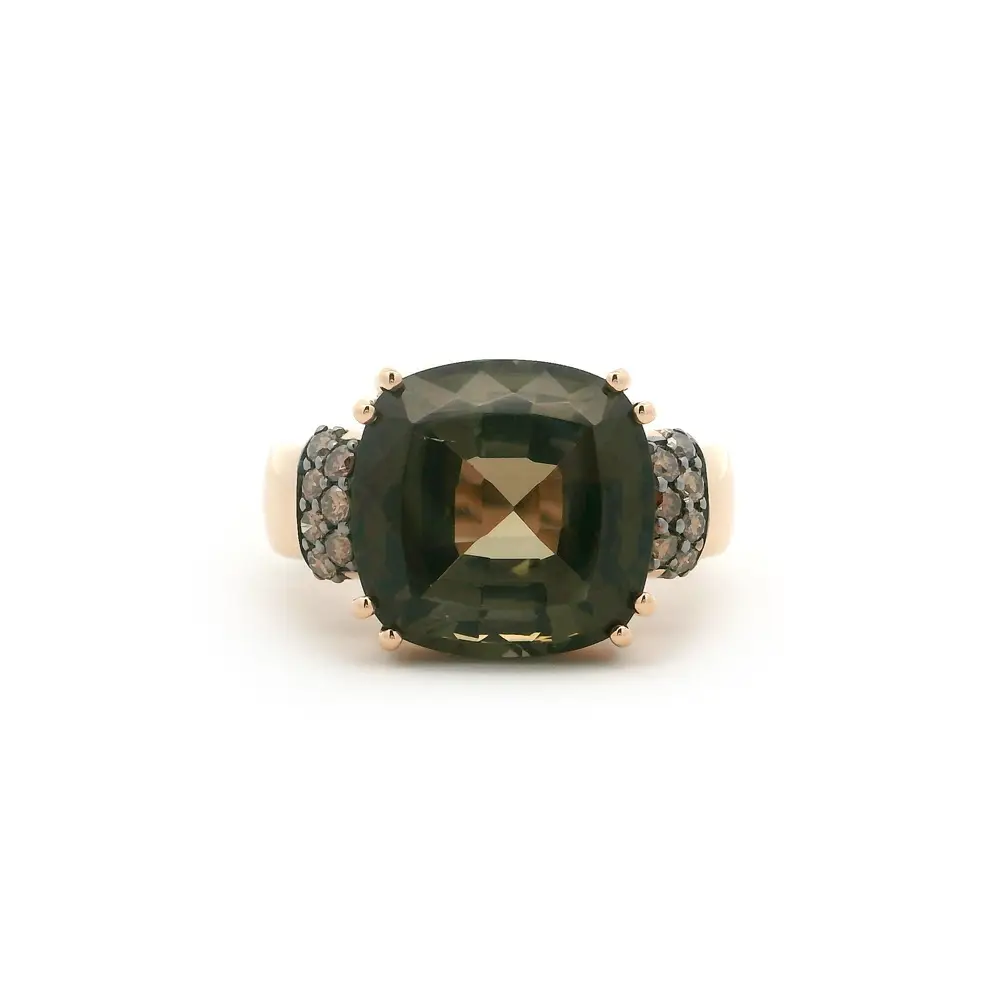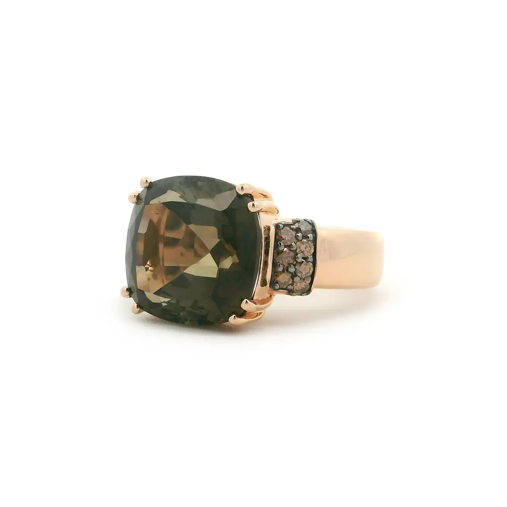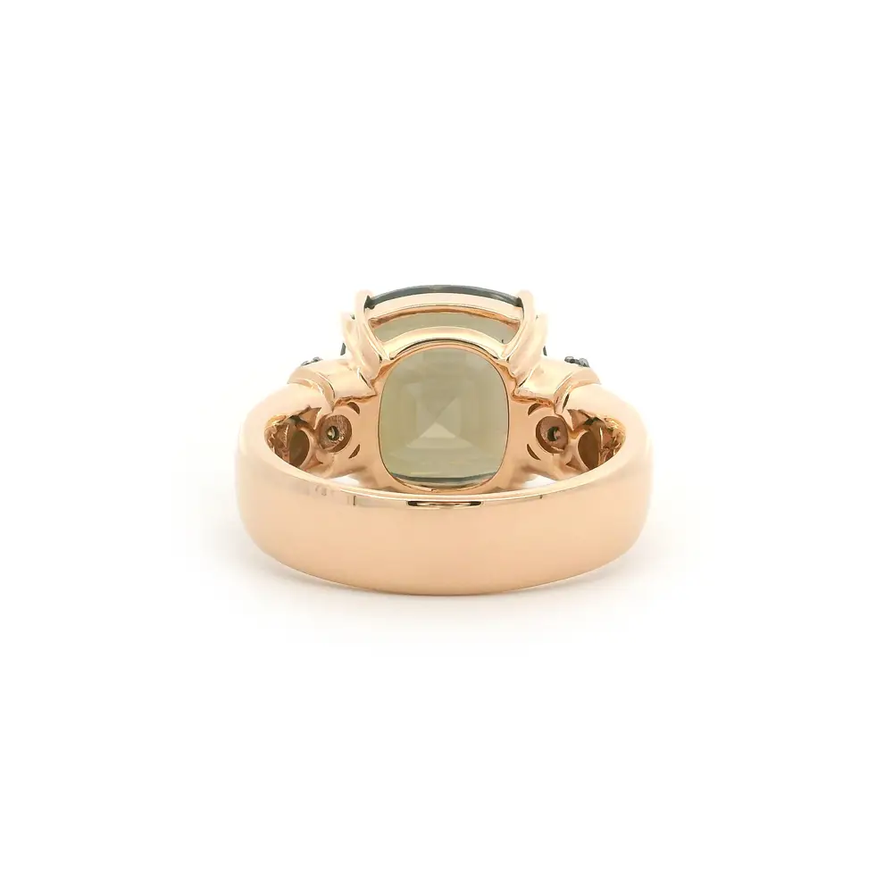 这款戒指以 18K玫瑰金 精制而成,展现出柔和而高贵的色调。中央镶嵌一颗 枕形切割绿色碧玺,深邃的色彩与金属光泽相得益彰。戒圈两侧点缀 闪耀的棕色钻石,增添温润光彩与奢华气息。