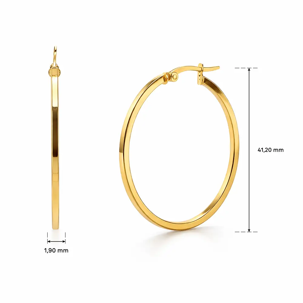经典的圆环造型搭配安全稳固的扣合设计,佩戴舒适可靠。耳环直径约 41.20 毫米,宽度约 1.90 毫米,整体轻盈通透,既适合日常佩戴,也可作为正式造型中的低调点缀。