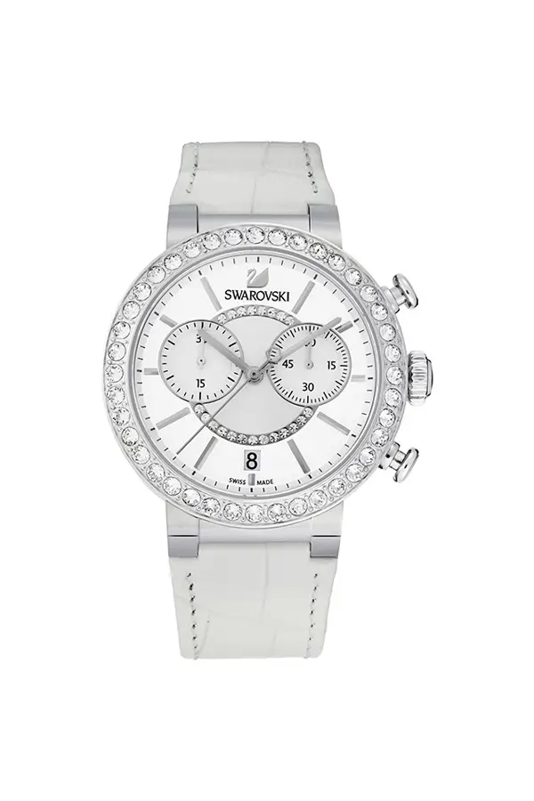 这款时尚、功能齐全的女式手表专为喜欢佩戴独特首饰的女士打造。灰白相间的表盘具有计时和日期显示功能,表盘内部和周边镶嵌着完美的施华洛世奇水晶。这款富有想象力的白色表款将成为您与闺蜜之间的谈资。