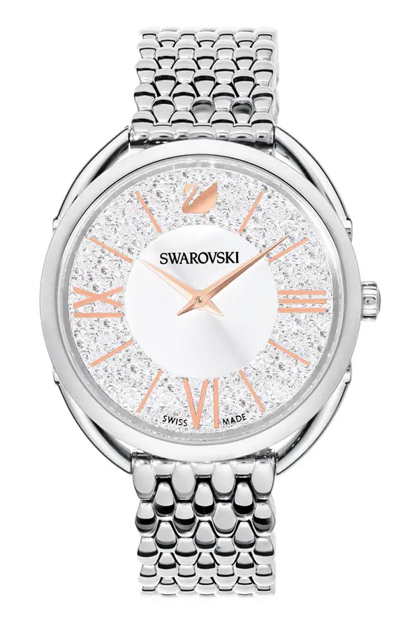 Crystalline Glam 系列女装腕表犹如冬日女王的魔法,将给您留下深刻印象。雪白的表盘上装饰着 800 多颗细小的施华洛世奇水晶。罗马数字刻度与指针一样,均为玫瑰金镀金。腕表配有精致的不锈钢表带。