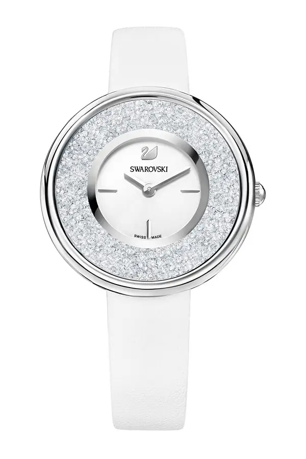Crystalline Pure 系列的时尚女装手表是对纯粹设计和精致女性气质的赞美。不锈钢表壳上有两个同心圆,外圈镶有 850 颗施华洛世奇水晶。较小的一圈则是简洁的白色表盘。腕表配以真皮表带。