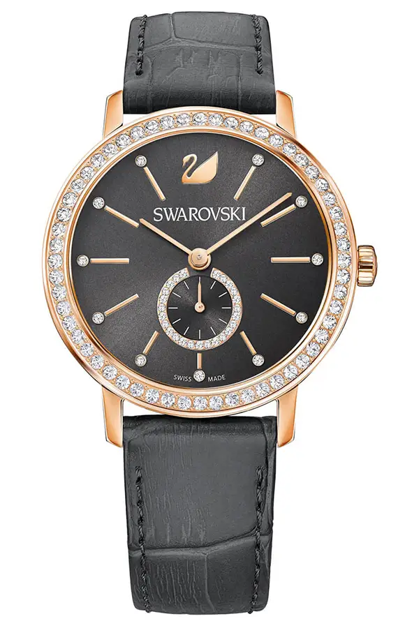 佩戴 Graceful Lady 手表,随时保持优雅别致,轻而易举。玫瑰金表壳内是烟灰色表盘,两侧镶嵌 56 颗透明施华洛世奇水晶。表带由黑色皮革制成,缝线精细。
