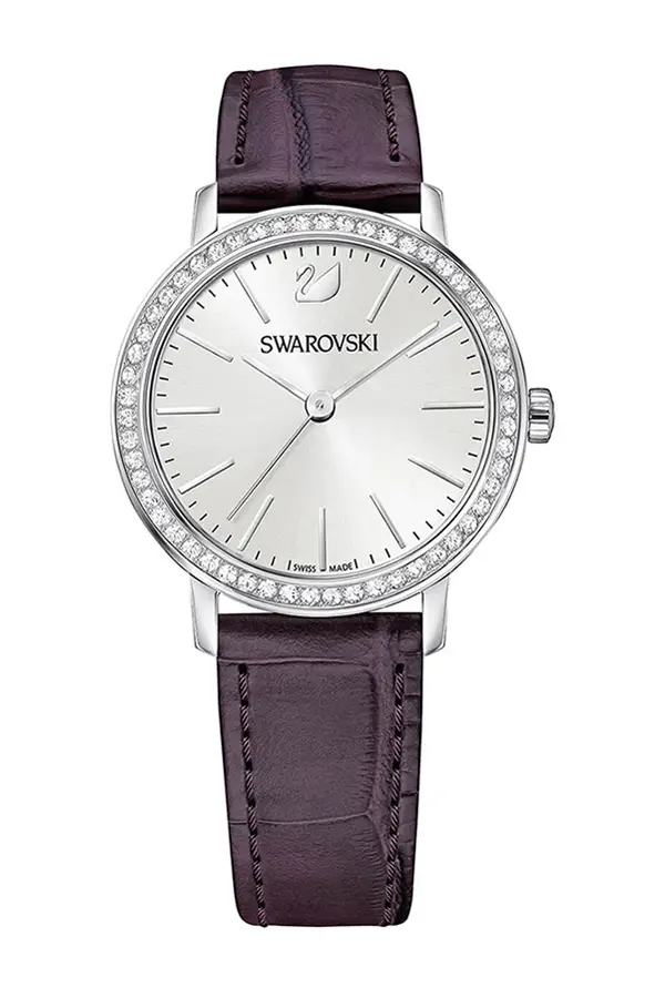 Graceful Lady Mini 手表专为不喜欢厚重表盘的人设计。这款手表采用简约的银色表盘,镶嵌 54 颗透明施华洛世奇水晶。酒红色表带由皮革制成。