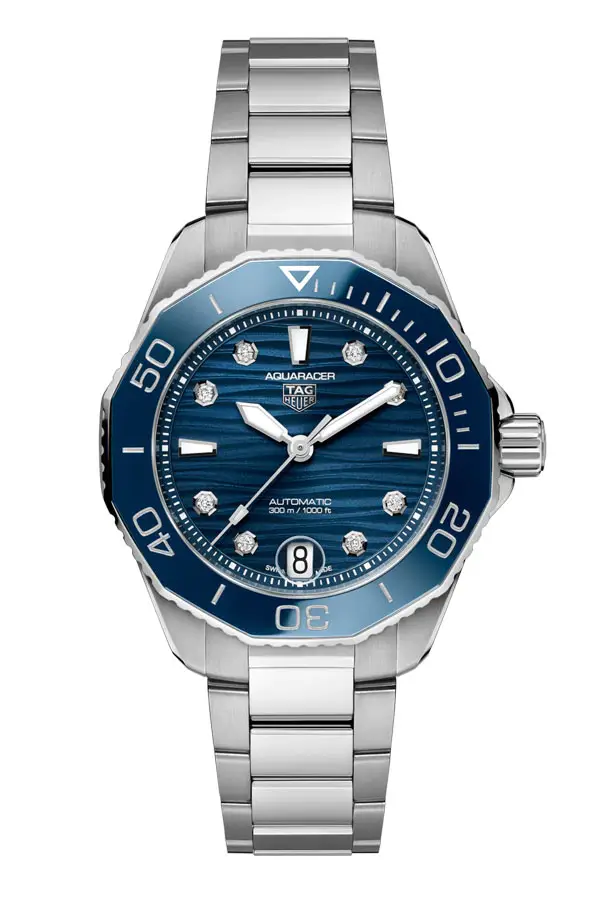 TAG Heuer Aquaracer Professional 300 WBP231B.BA0618 完美融合运动耐用性与优雅气质。36 毫米精钢表壳搭配 单向旋转陶瓷表圈 和防反光蓝宝石镜面。蓝色波浪纹表盘上镶嵌 8 颗钻石刻度,总重 0.077 克拉,尽显精致风格。