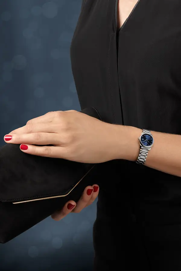 在 蓝色放射纹表盘 上,钻石时标 增添精致与奢华感。银色指针与深蓝色表盘形成对比,既确保清晰读时,又保持优雅和谐。