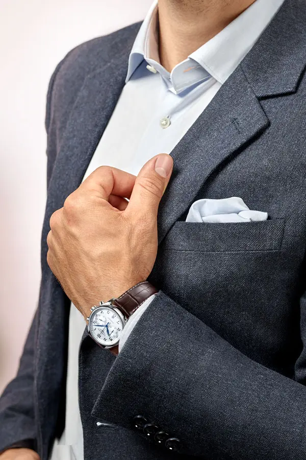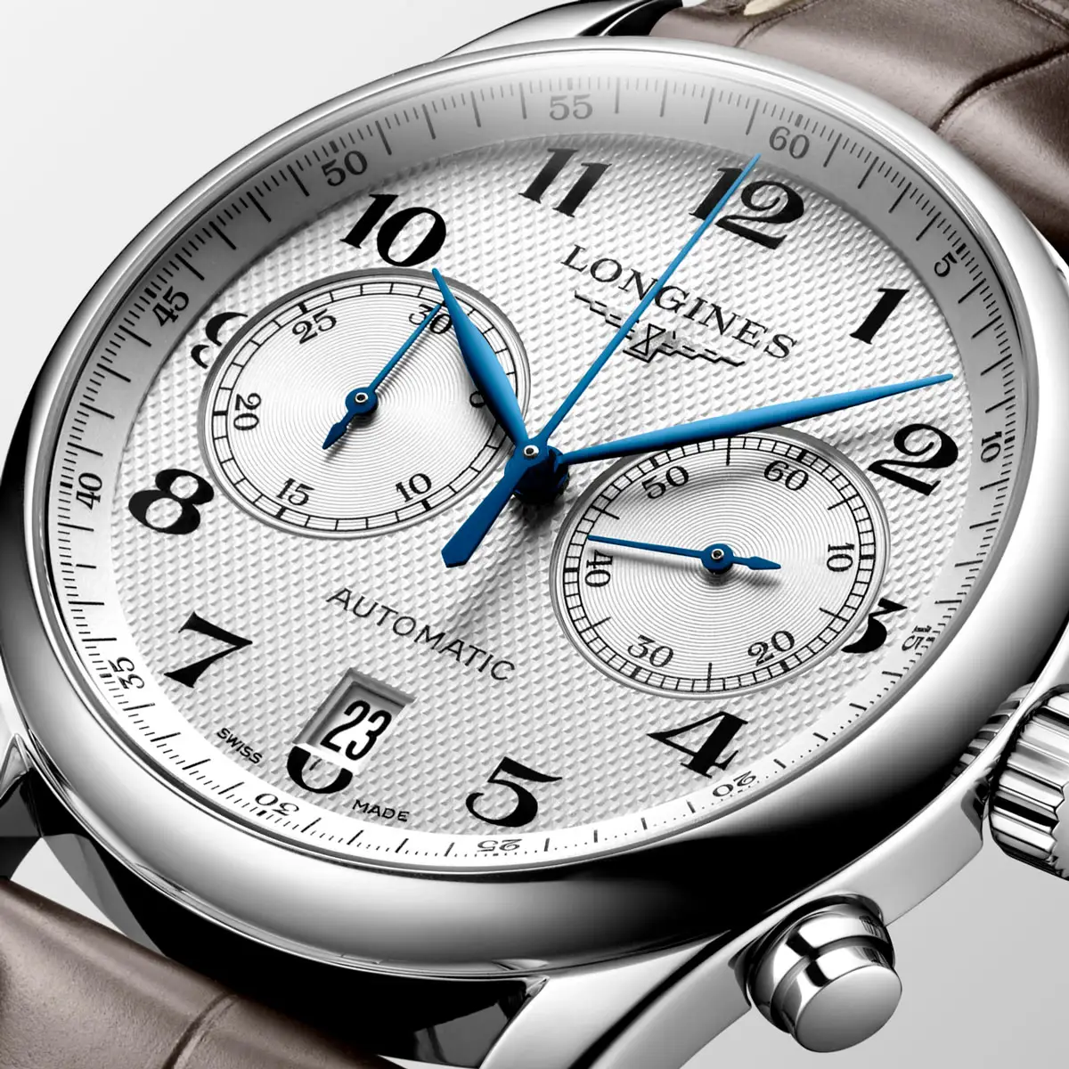 在 银色「barleycorn」表盘 上,蓝钢指针、阿拉伯数字和计时小表盘相互辉映。6 点钟位置设有日期窗,保持整体平衡,同时计时功能增添运动优雅气质。