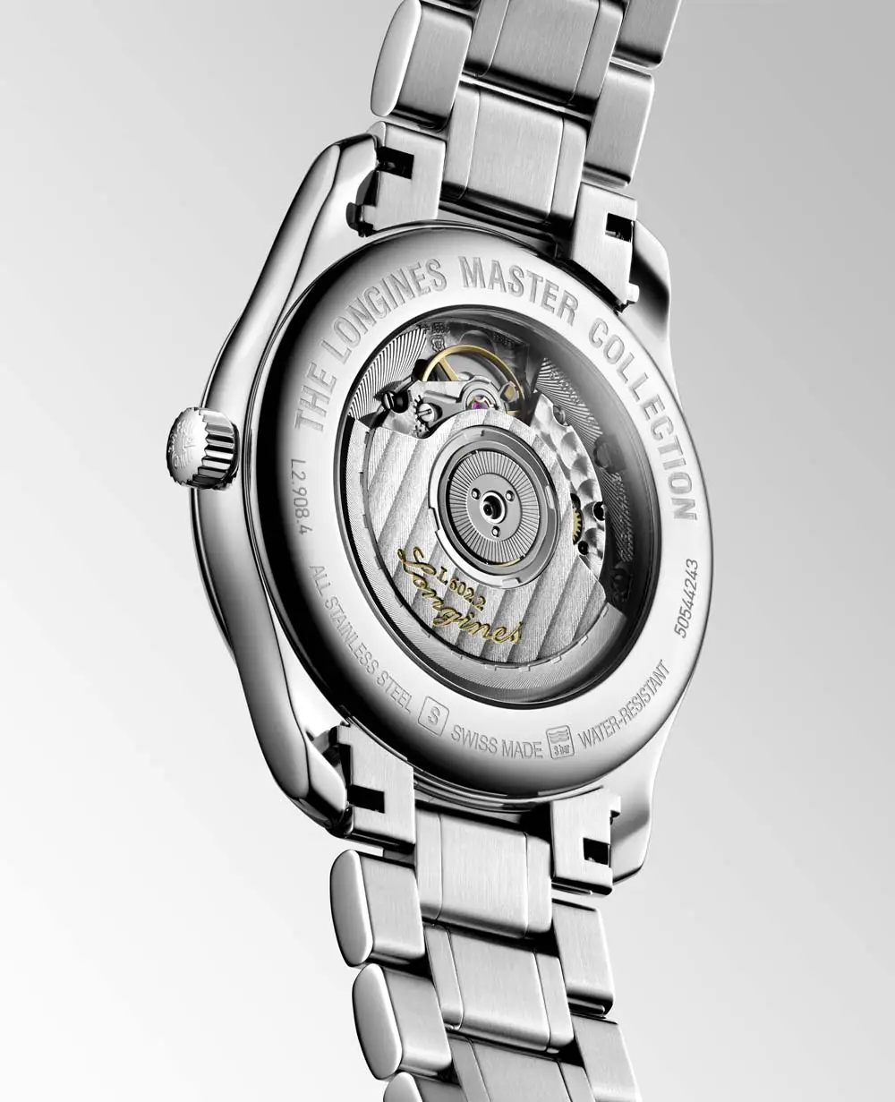 腕表搭载自动机芯 L602,确保精准走时并清晰显示剩余动力。具备 30 米 (3 ATM) 防水性能,搭配 精钢表链与三重安全折叠扣,完美展现 浪琴 Master 系列 的优雅气质。