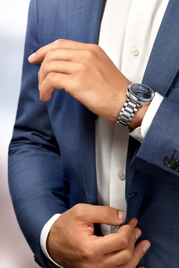 在 蓝色放射纹表盘 上,立体刻度与银色指针相得益彰。6 点钟位置的副盘结合 月相显示 与日期功能,兼具实用性与视觉魅力。