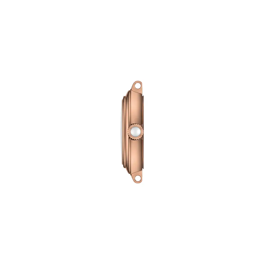 Tissot Ballade 34 mm 以 34 毫米表径 和 双色不锈钢搭配黄色黄金 PVD 涂层,呈现出和谐的女性优雅与纯净气质。银色表盘饰以精致的 机刻纹(guilloché),配以立体时标,使腕表更显高雅;均衡的比例亦赋予其永不过时的魅力。