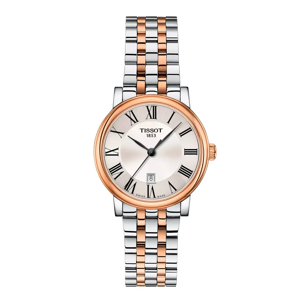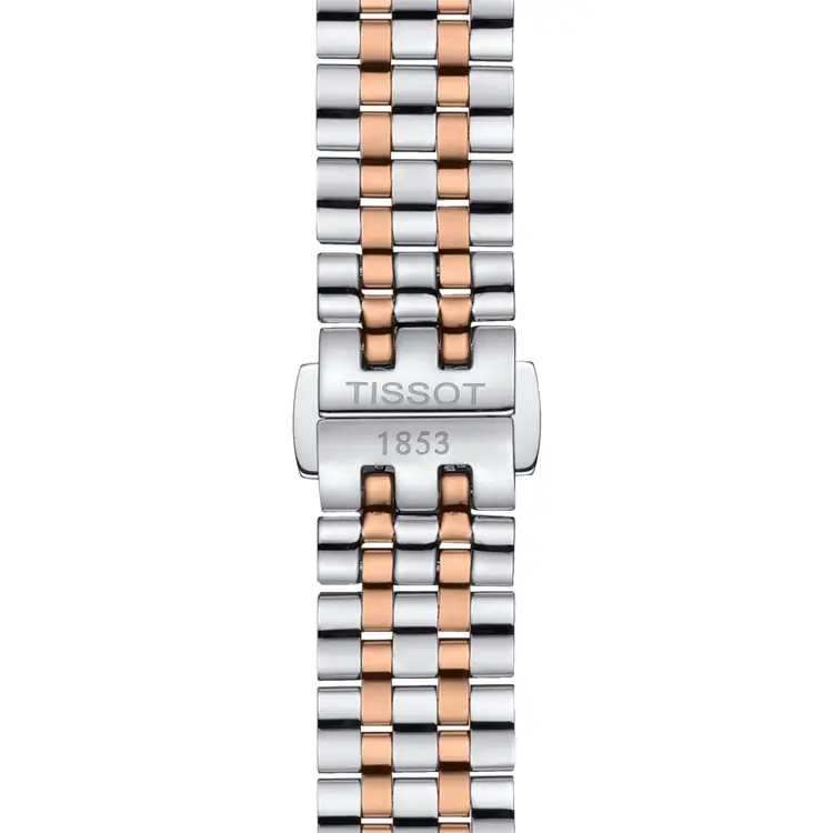 双色不锈钢表链搭配玫瑰金 PVD 镀层,配有 蝴蝶扣与按键设计,稳固又舒适。Tissot Carson Premium Lady T122.210.22.033.01 是追求 永恒优雅、细腻奢华与瑞士制表精髓 女士的理想之选。