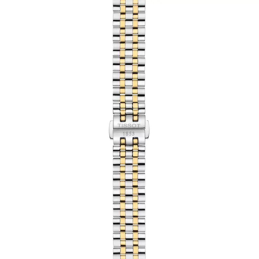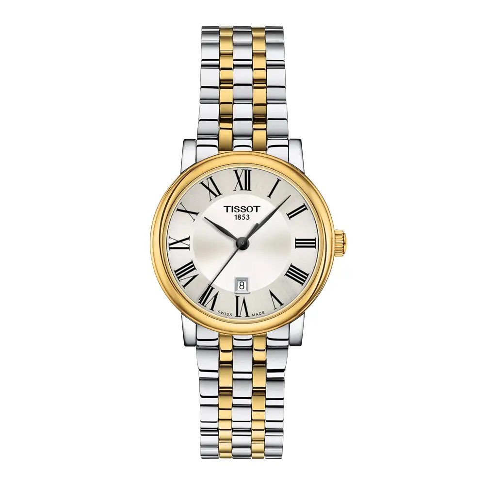 Tissot Carson Premium Lady T122.210.22.033.00 将经典风格与精致的珠宝气质完美结合。其 双色(bicolor)设计 使用 316L 精钢 与 黄色 PVD 镀层 搭配,呈现优雅且恒久的女性魅力。30 毫米表壳 配合约 6.7 毫米的纤薄厚度,显得格外精致,而银色表盘搭配 罗马数字与 6 点钟日期显示。