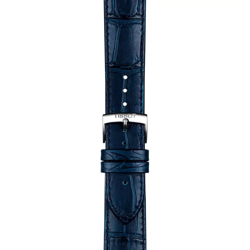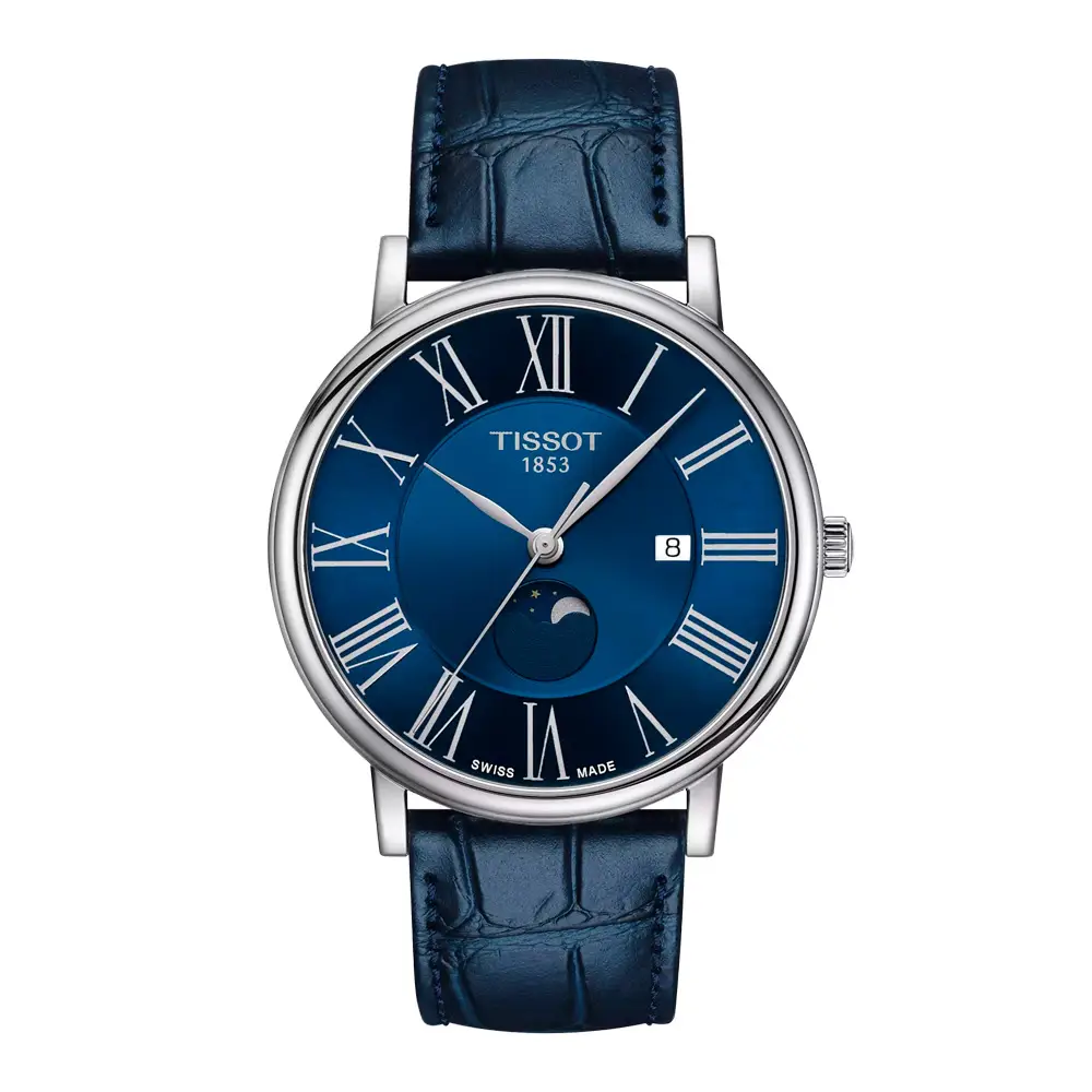这款 Tissot Carson Premium Moonphase 腕表完美融合了 永恒优雅与瑞士制表工艺。40 毫米 316L 精钢表壳 经过精细抛光,搭配 深蓝色表盘、罗马数字刻度 及 6 点钟位置月相显示,彰显浪漫与精准的完美平衡。