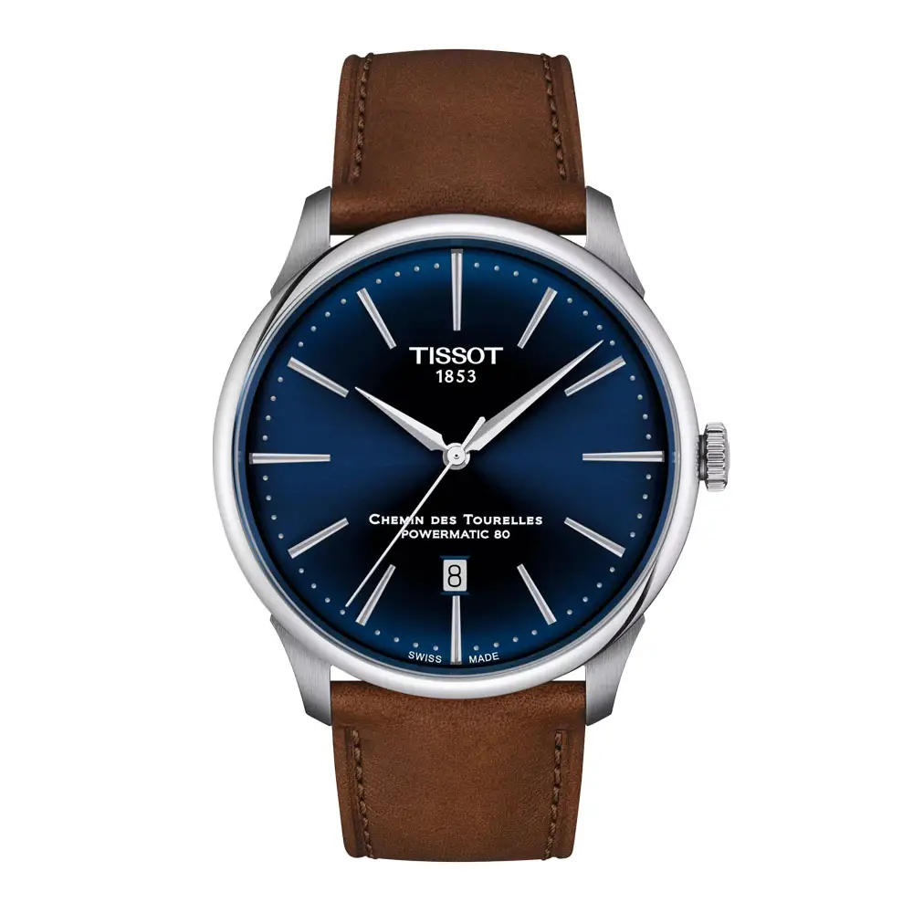 Tissot Chemin des Tourelles Powermatic 80 T139.407.16.041.00 来自 Tissot,完美融合瑞士经典优雅与现代制表技术。42毫米316L不锈钢表壳搭配优雅的蓝色太阳纹表盘与精致刻度,并由**弧形蓝宝石玻璃(带防反射涂层)**保护。Chemin des Tourelles 系列设计源自品牌历史,适合日常与正式场合佩戴。