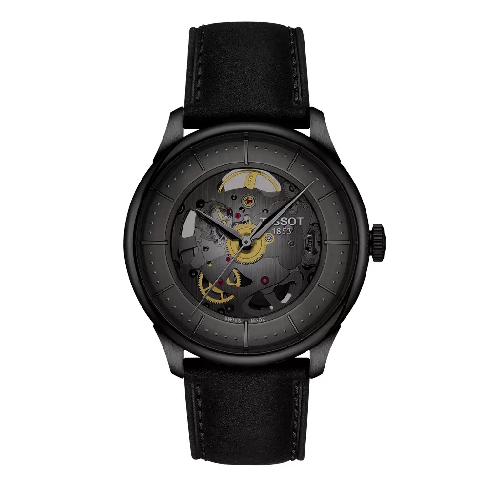 Tissot Chemin des Tourelles Squelette 以大胆现代的方式诠释瑞士传统制表工艺。其 镂空表盘 展示了腕表机械内部结构,让每一个细节都一览无余。优雅的设计搭配 39 mm 表壳,采用 316L 精钢并配黑色 PVD 涂层,呈现出现代与经典融合的气质。