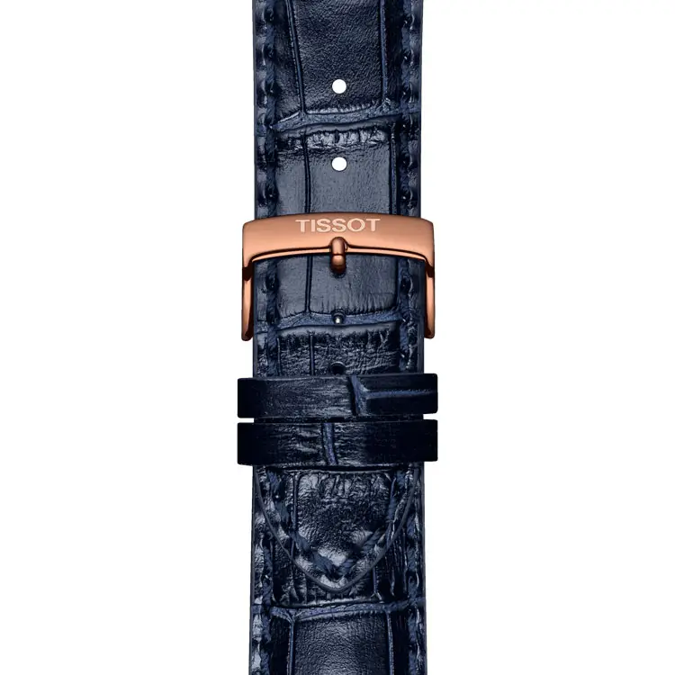 蓝色皮革表带采用鳄鱼纹设计,并配有印有 Tissot 标志的 针扣式表扣,佩戴舒适安全。