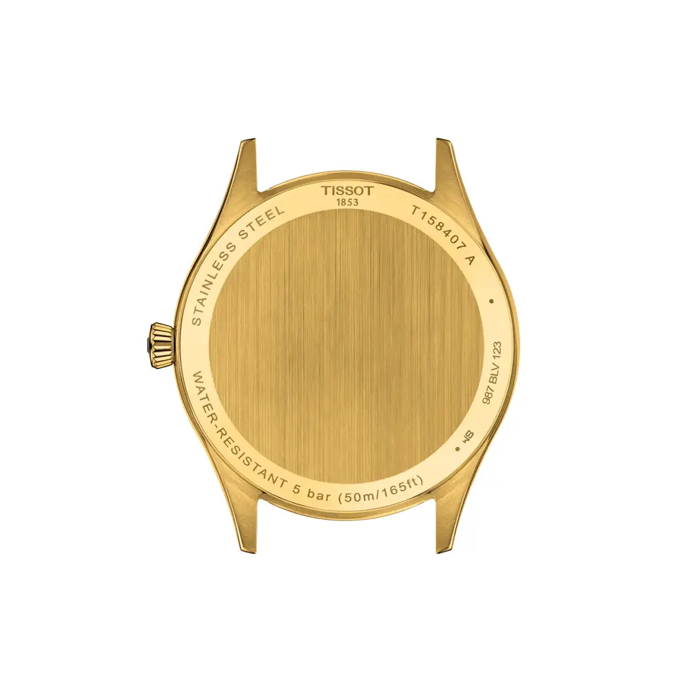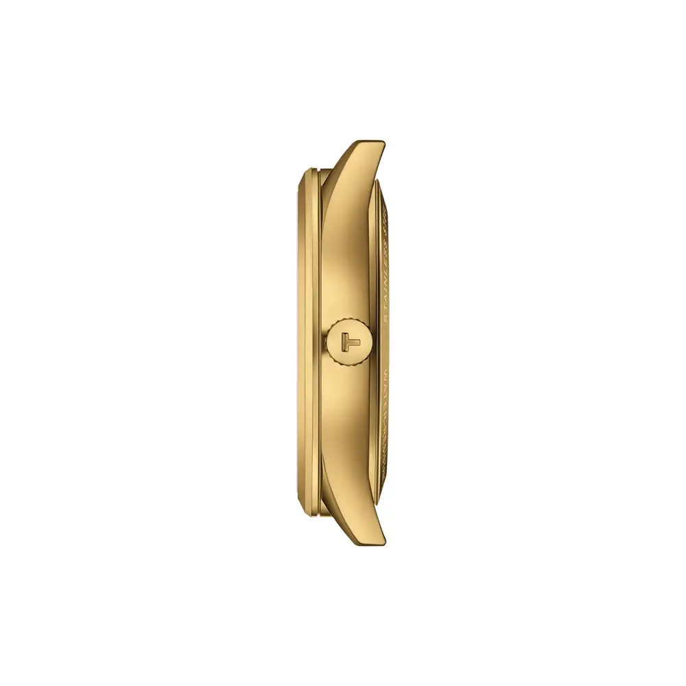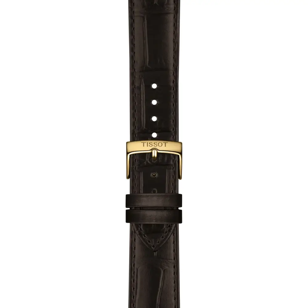 Tissot Classic Dream Powermatic 80 以优雅的 40 mm 尺寸呈现经典美学与现代机械性能的结合。腕表采用 316L 不锈钢表壳并覆以黄色黄金 PVD 涂层,搭配蓝宝石玻璃与 50 米(5 bar)防水性能,适合日常佩戴与正式场合。棕色皮表带带有细腻纹理,突显腕表温润而恒久的气质。