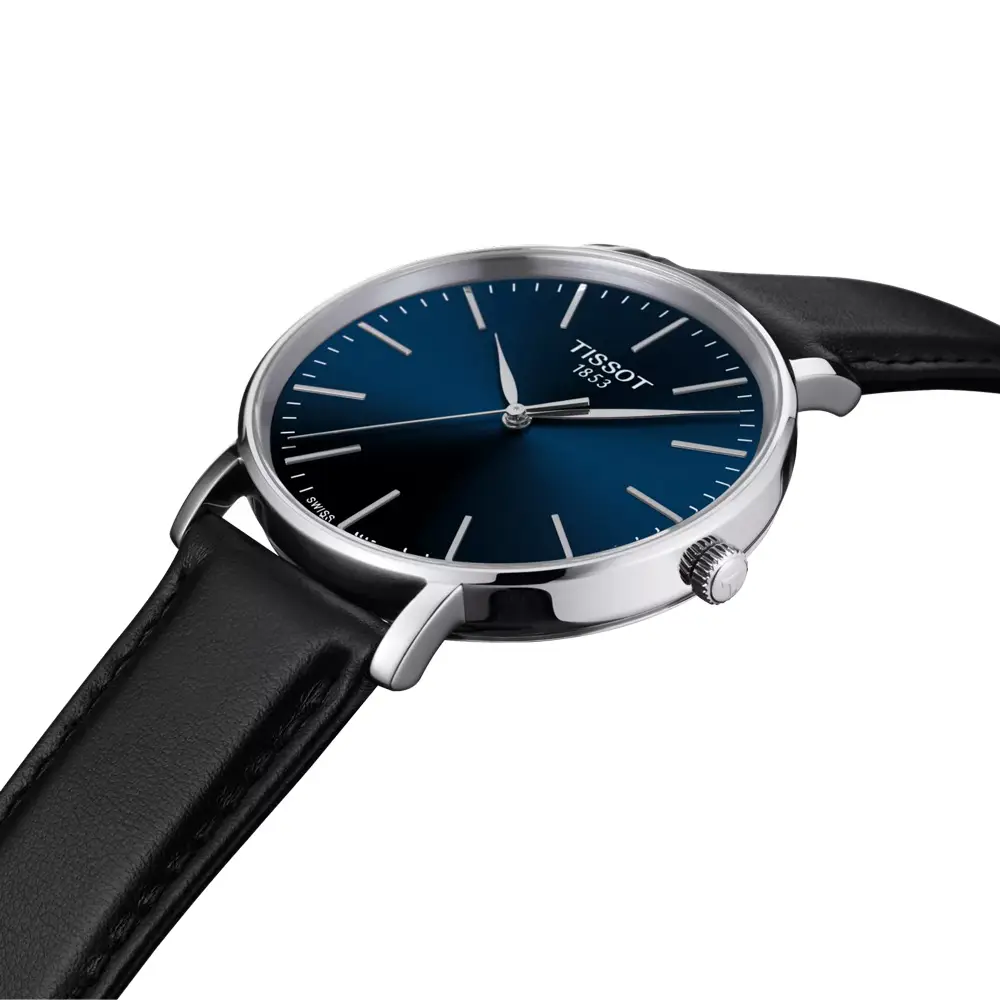 Tissot Everytime Gent T143.410.16.041.00 以 简洁设计与瑞士优雅 为核心,展现出现代极简风格。其 40 毫米 316L 不锈钢表壳 搭配醒目的 蓝色表盘,呈现清爽、时尚且百搭的视觉效果。经典的 黑色皮表带 进一步提升整体优雅气息,使腕表适合日常佩戴与正式场合。