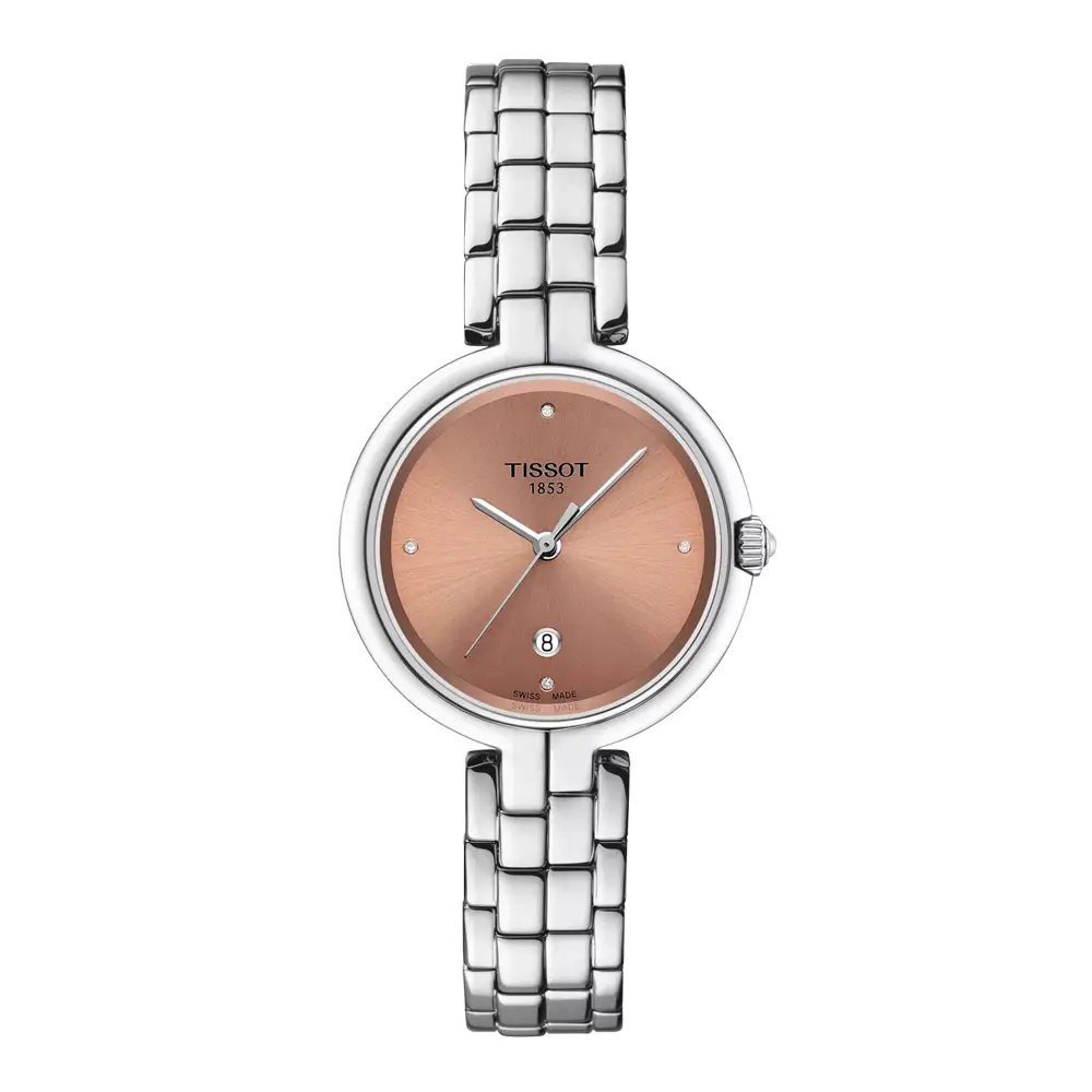 Tissot Flamingo T094.210.11.336.00 展现出 女性优雅与瑞士工艺, 适合日常佩戴与正式场合。柔和的 粉色表盘搭配 4 个钻石刻度, 呈现出现代且精致的视觉效果。