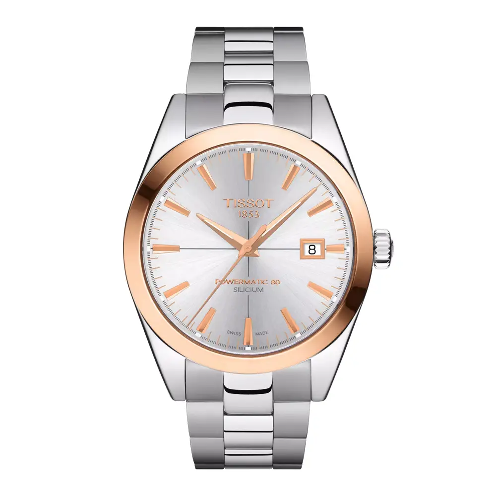 Tissot Gentleman Powermatic 80 Silicium 18K Gold Bezel T927.407.41.031.00 以优雅的运动风格脱颖而出,将日常实用性与高级制表元素巧妙结合。41 毫米 316L 精钢表壳 搭配 18K 玫瑰金表圈,呈现奢华与功能美学的完美平衡。银色放射纹表盘突显设计的纯净与现代感。