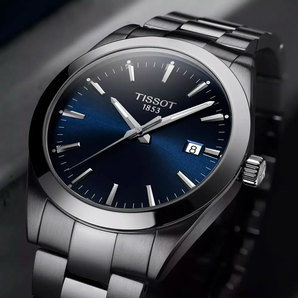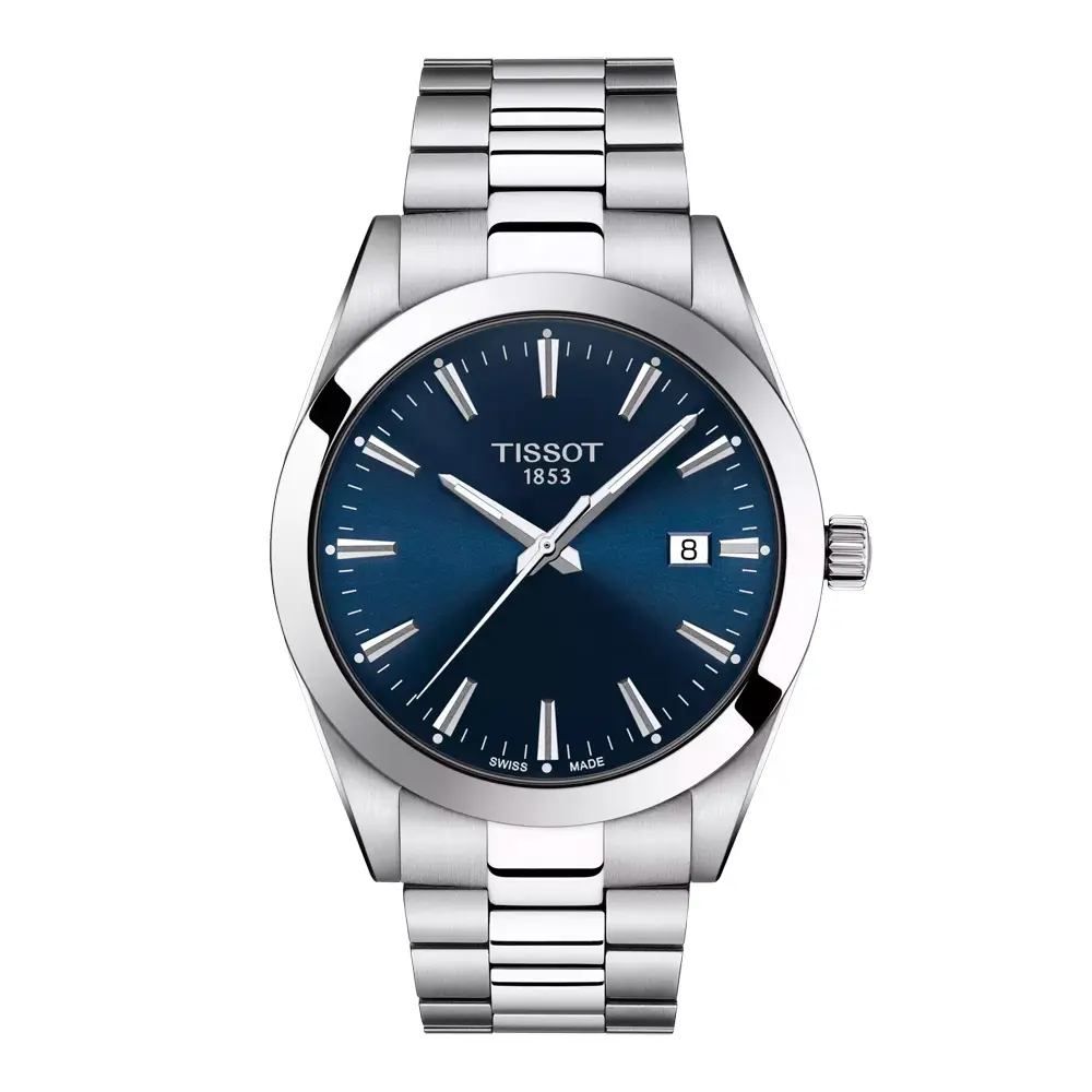 天梭 Tissot Gentleman T127.410.11.041.00 融合了 经典优雅、现代功能与瑞士精准。40 毫米不锈钢表壳 搭配 蓝色表盘,配有 抛光刻度与指针,彰显腕表的永恒魅力。3 点钟位置日期窗 增添日常实用性。
