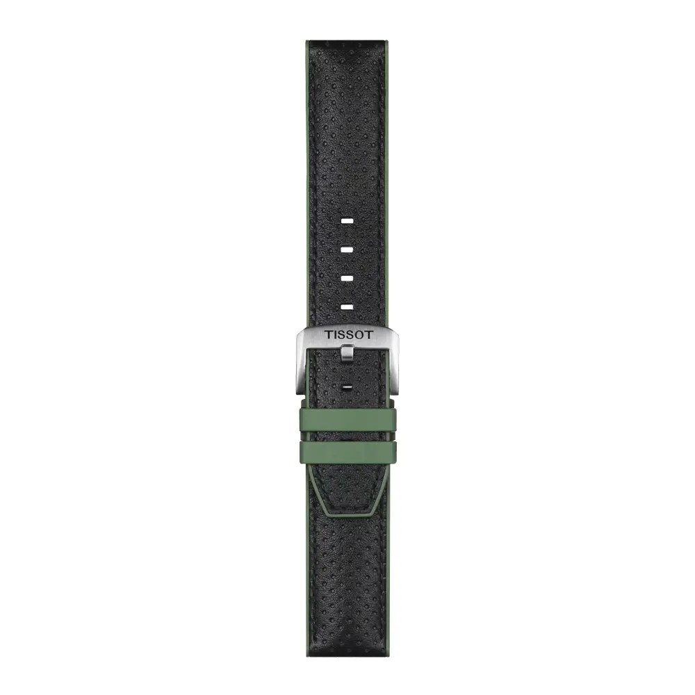 原装 Tissot 绿色黑色表带 T852.046.787 宽度 22 毫米,是一款兼具优雅与实用性的选择,适用于部分天梭腕表。表带外层采用 压纹牛皮,内衬为耐用的 橡胶材质,既具备精致外观,又能抵御湿气和日常磨损。