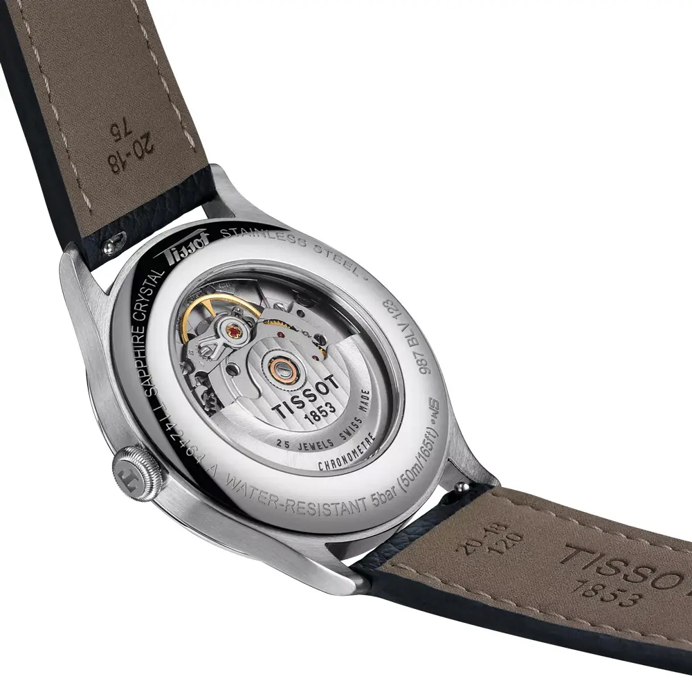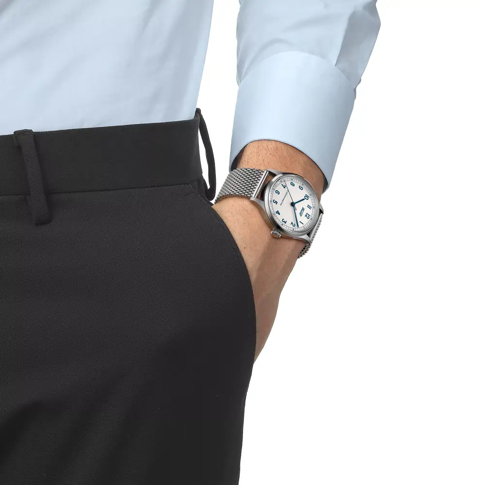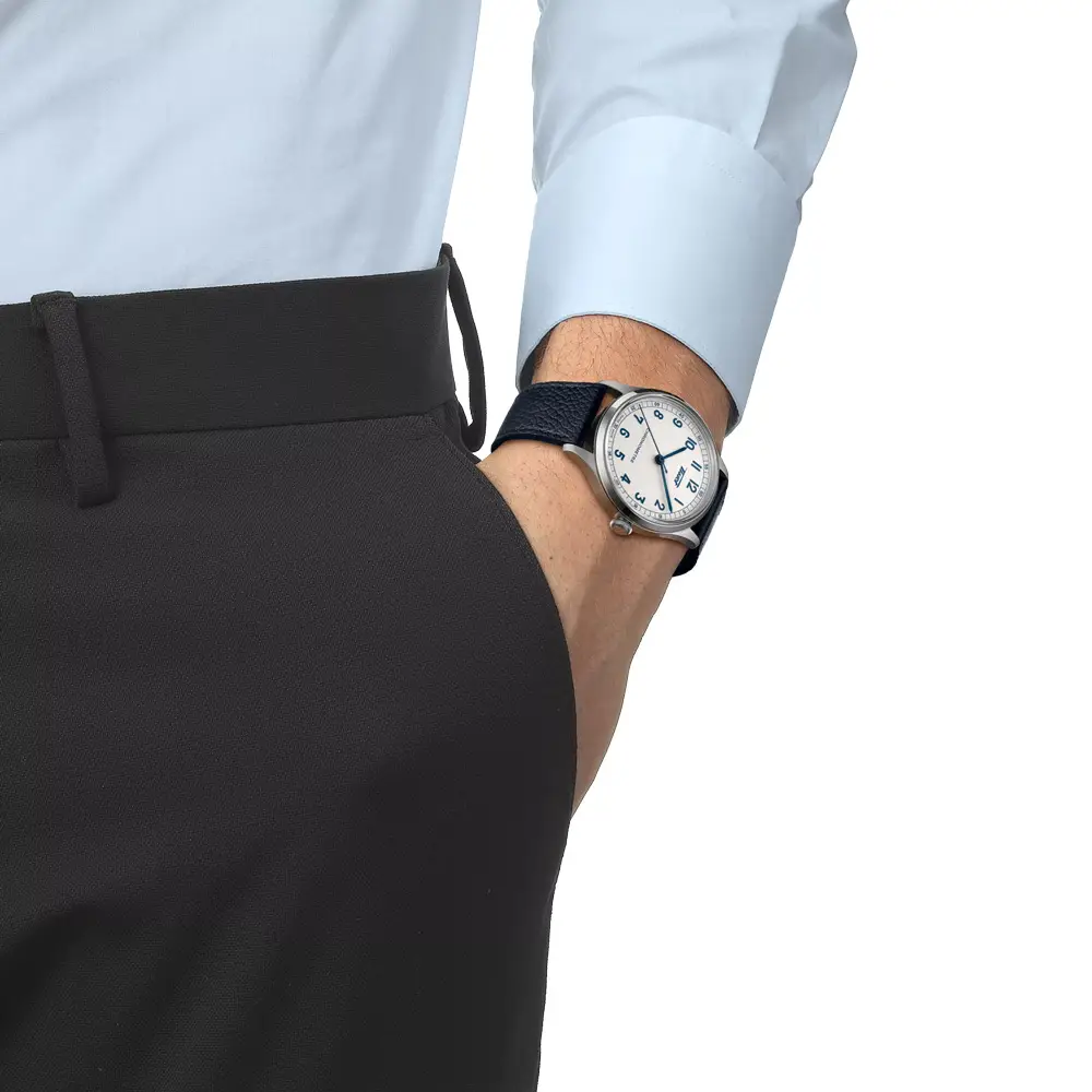 Tissot Heritage 1938 Automatic COSC 以简洁而功能性的设计向瑞士制表传统致敬。39 毫米精钢表壳、银色纹理表盘及铁路式刻度展现复古格调,搭配阿拉伯数字与深色皮表带,优雅而经典。