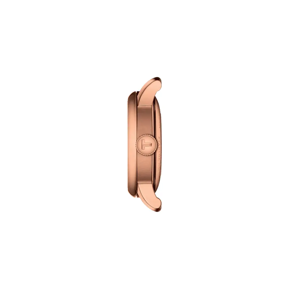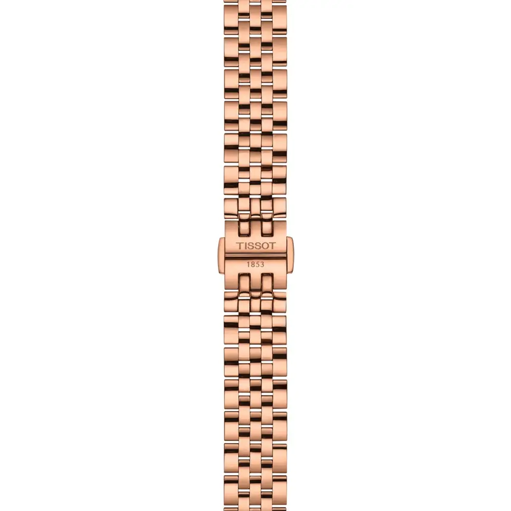 Tissot Le Locle 是一款优雅的女士腕表,灵感来自瑞士传统制表工艺。该系列以品牌诞生地勒洛克勒(Le Locle)命名,并以经典设计和精致的玑镂纹表盘著称。不锈钢表壳配玫瑰金 PVD 涂层搭配绿色表盘,呈现现代而经典的外观。