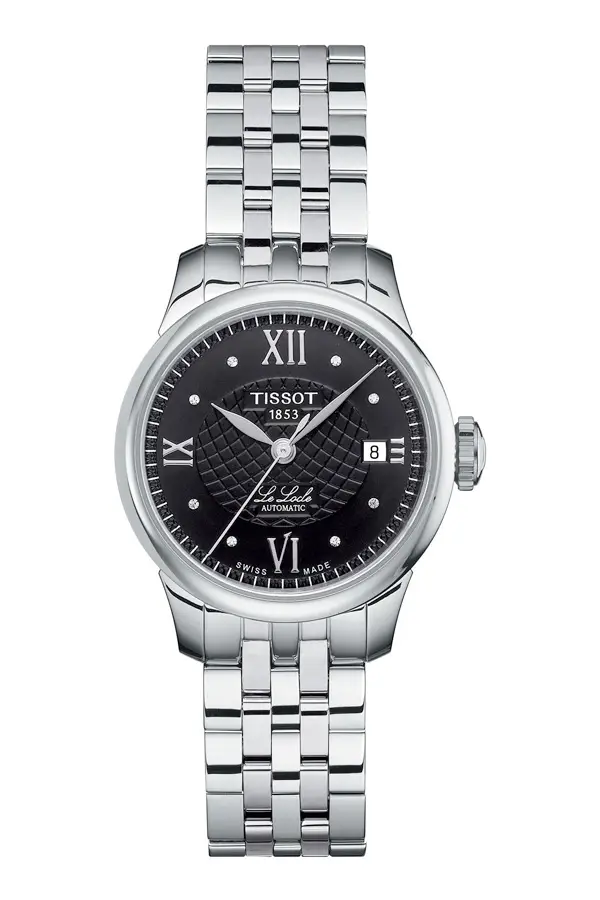 这款腕表采用直径为25.3毫米的不锈钢表壳。表盘为黑色,镶有钻石时标和罗马数字刻度,为腕表增添了奢华感。在3点钟位置有一个日期显示窗口,提高了这款表款的实用价值。蓝宝石水晶玻璃镜面耐刮擦,确保腕表的持久美观和耐用性。