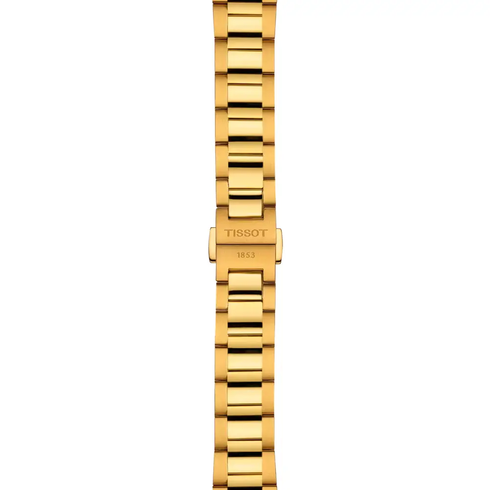 具备 10 ATM(100 米)防水性能,适合游泳等日常接触水的活动。金色不锈钢表链配有黄色 PVD 镀层 和 折叠扣,佩戴既安全又舒适。Tissot PR 100 是追求优雅、实用与瑞士品质的女士的不二之选。