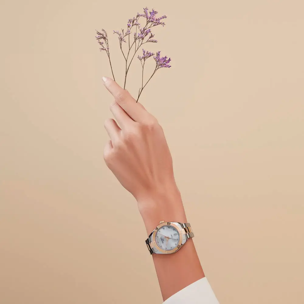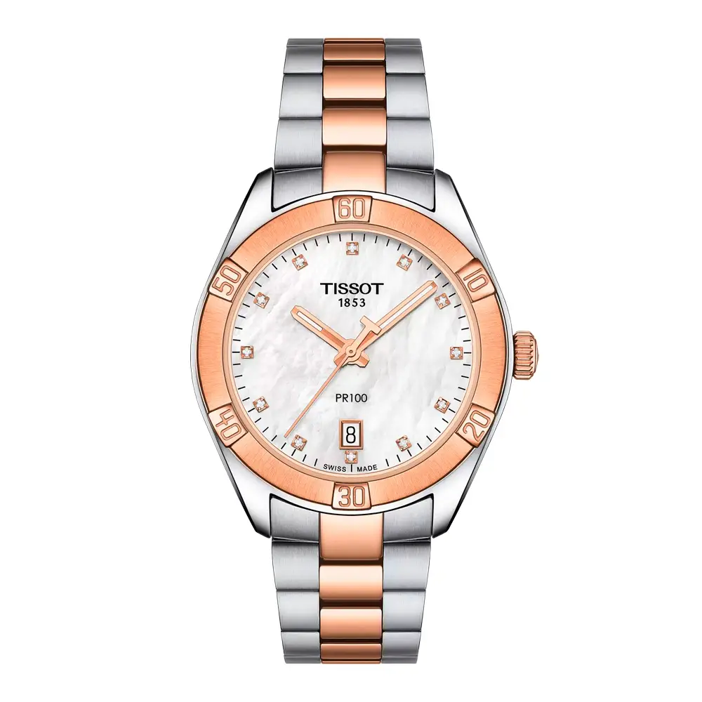 这款 天梭 Tissot PR 100 Lady Sport Chic T101.910.22.116.00 将 运动精神与女性优雅 完美融合。36毫米316L不锈钢表壳 覆以 玫瑰金PVD镀层,搭配 镶钻珍珠母贝表盘,散发柔美而奢华的气息。
