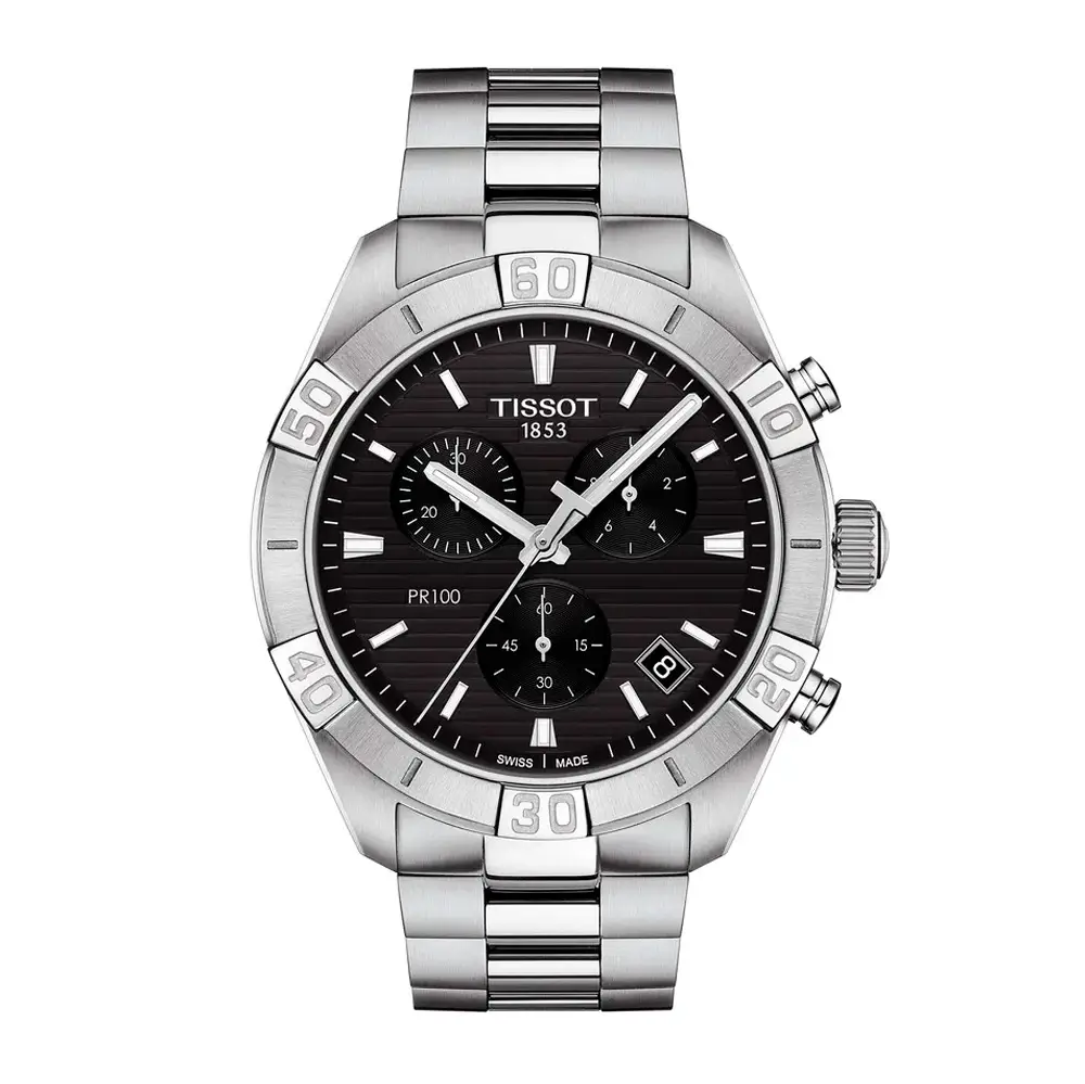 天梭 Tissot PR 100 Sport Gent Chronograph T101.617.11.051.00 融合了 运动优雅、卓越性能与瑞士精准。44 毫米不锈钢表壳 搭配 黑色表盘,配有 三眼计时盘、对比色指针与刻度,在各种光线下都能清晰读时。