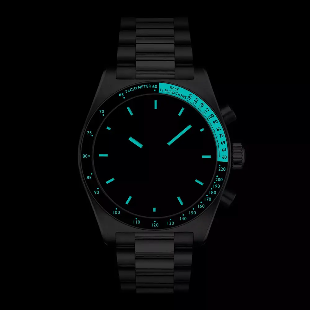 40 mm 表壳采用 316L 精钢打造,并配备 防眩光蓝宝石镜面以提高抗刮性。腕表具备 测速计(Tachymeter) 与 100 m(10 ATM)防水性能,适合日常涉水与游泳。精钢表链与蝴蝶扣确保佩戴舒适与稳固。