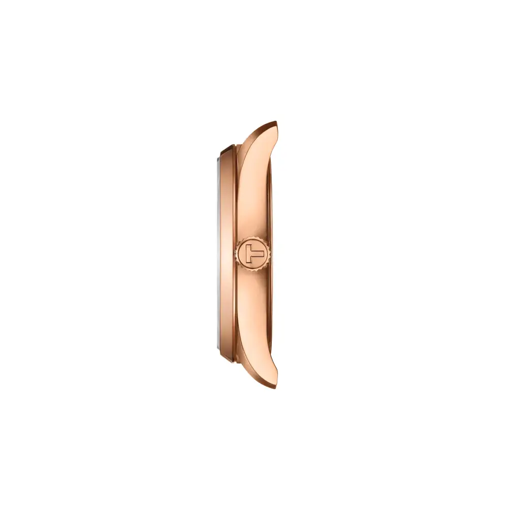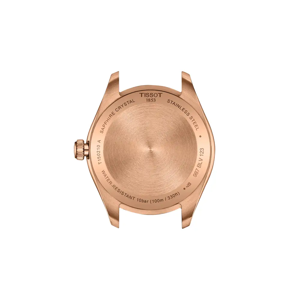 Tissot PR 100 Lady 采用 34 mm 不锈钢表壳及玫瑰金 PVD 涂层,呈现出现代而优雅的女士腕表风格。蓝宝石玻璃、316L 钢材质以及 100 米(10 bar)防水性能,使其足以胜任日常佩戴甚至稍具运动性的生活方式。