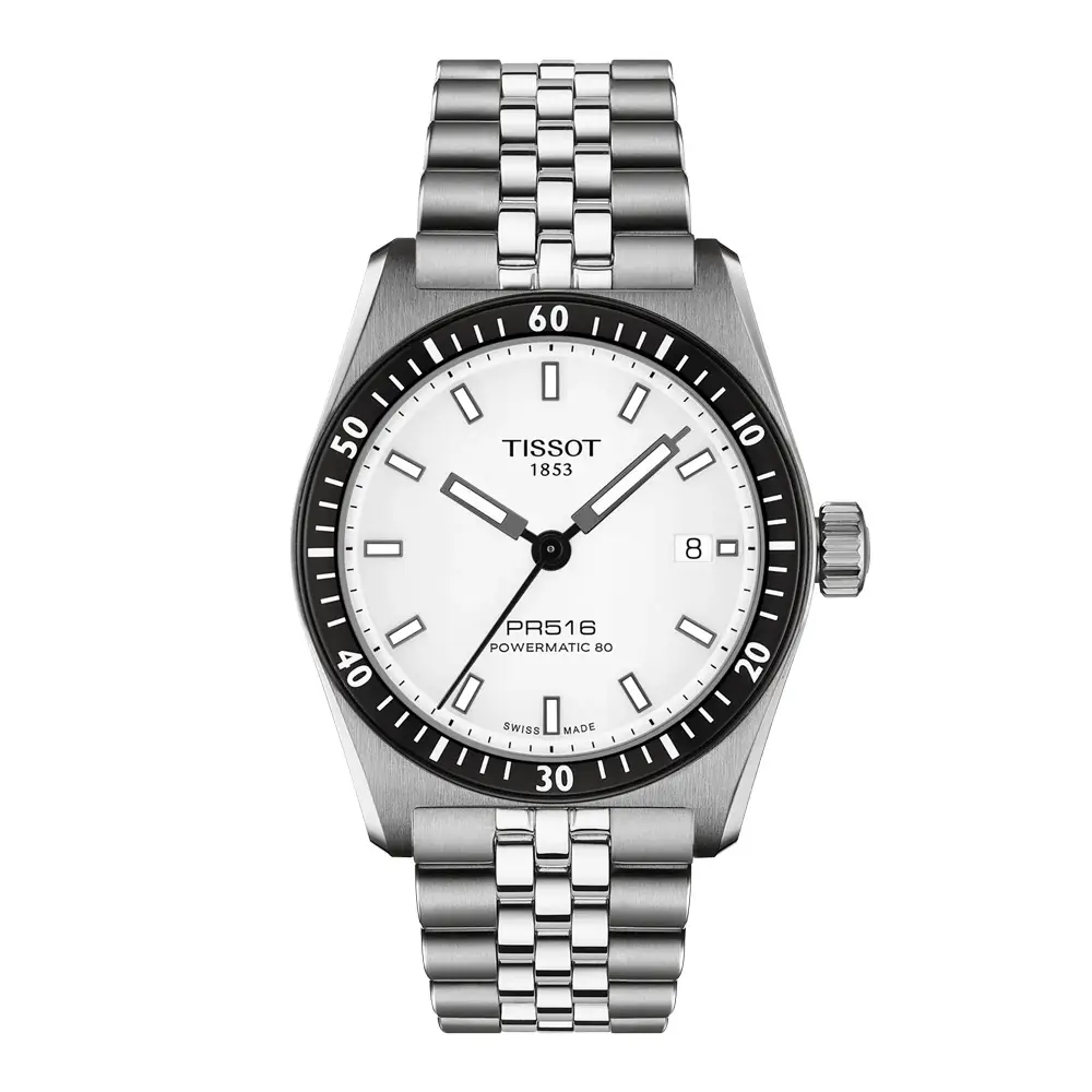 Tissot PR516 Powermatic 80 T149.407.11.031.00 男士腕表结合了瑞士制表传统、运动设计和现代技术。该型号属于经典的 PR516 系列,灵感来自 20 世纪 60 年代的赛车腕表。白色表盘搭配夜光刻度,不仅清晰易读,也展现出运动与优雅兼具的设计风格。