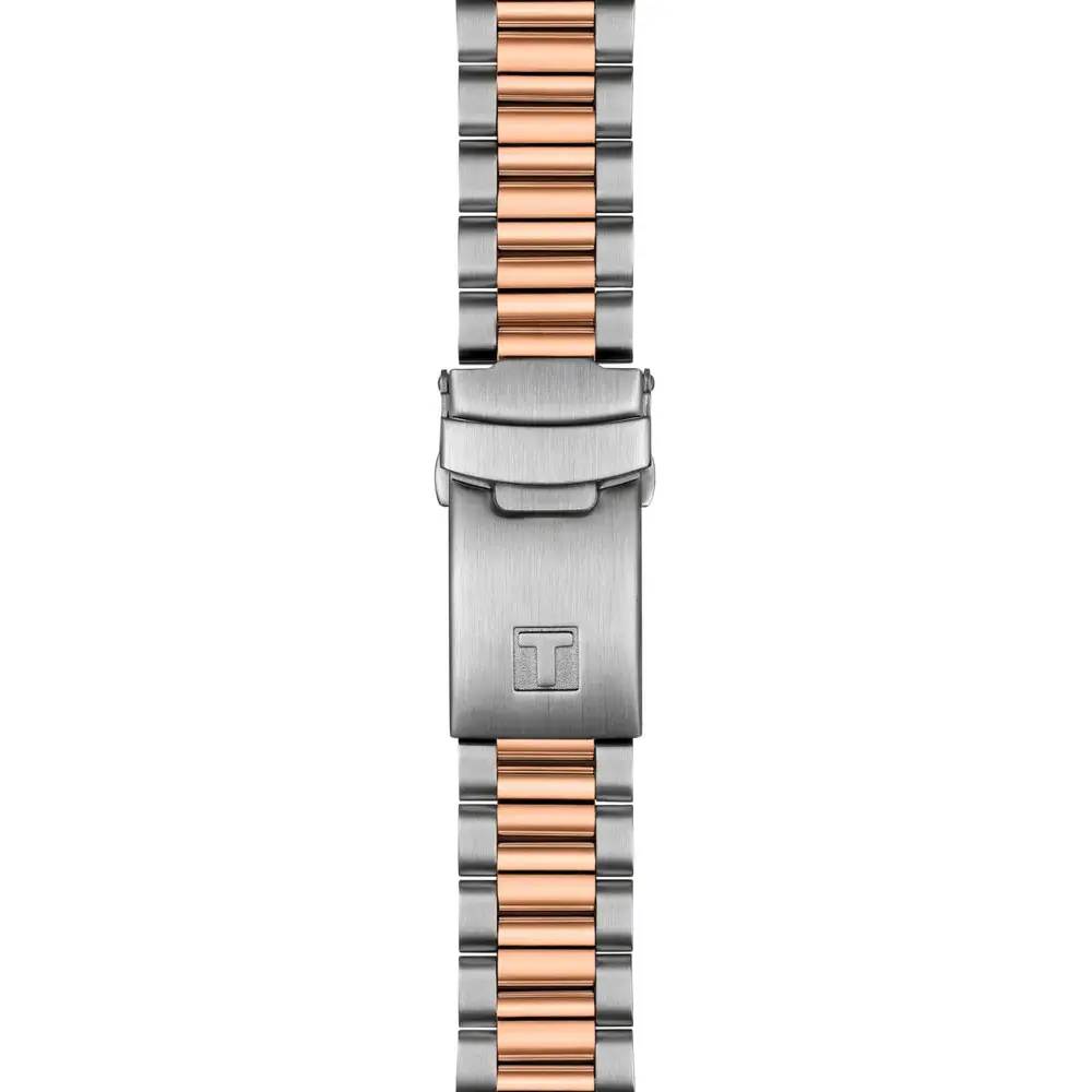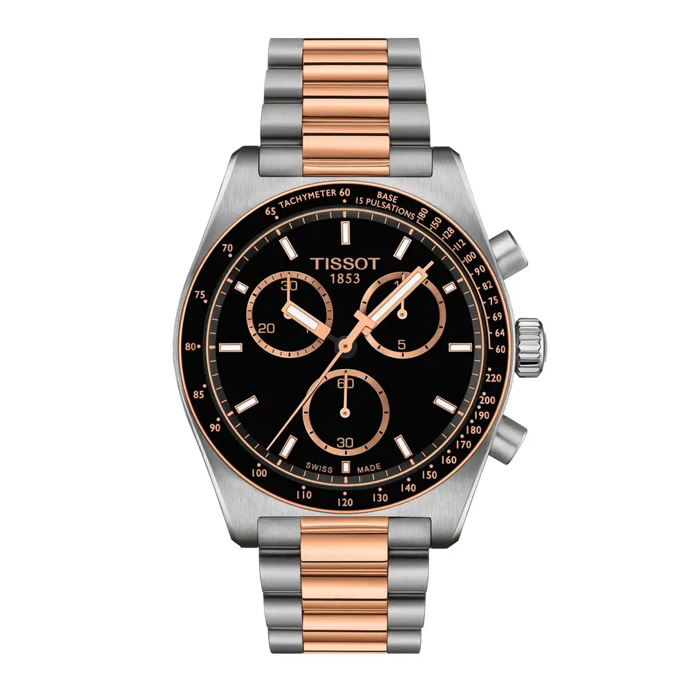 Tissot PR516 石英计时码表 T149.417.22.051.01是对经典运动表款的现代演绎,灵感源自 20 世纪 60 年代的赛车运动。闪亮的精钢材质与玫瑰金 PVD 涂层的鲜明对比,使这款手表显得精致而不失活力。