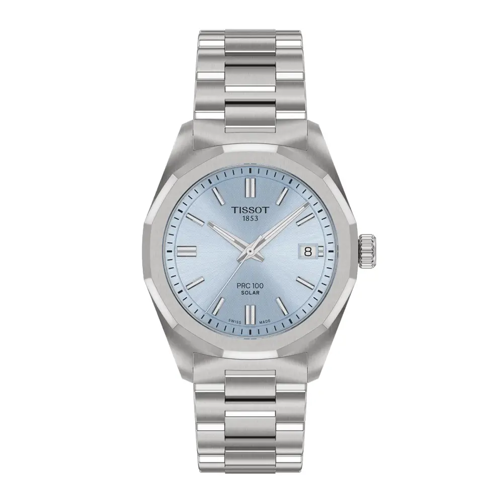 Tissot PRC 100 Solar 以 34 mm 小巧尺寸呈现运动优雅与现代太阳能技术的结合。腕表采用 316L 不锈钢表壳、蓝宝石玻璃,并具备 100 米(10 bar)防水性能,无论日常佩戴还是轻度运动都非常可靠。精钢表链配备蝴蝶扣与快拆系统,确保佩戴舒适且易于搭配。